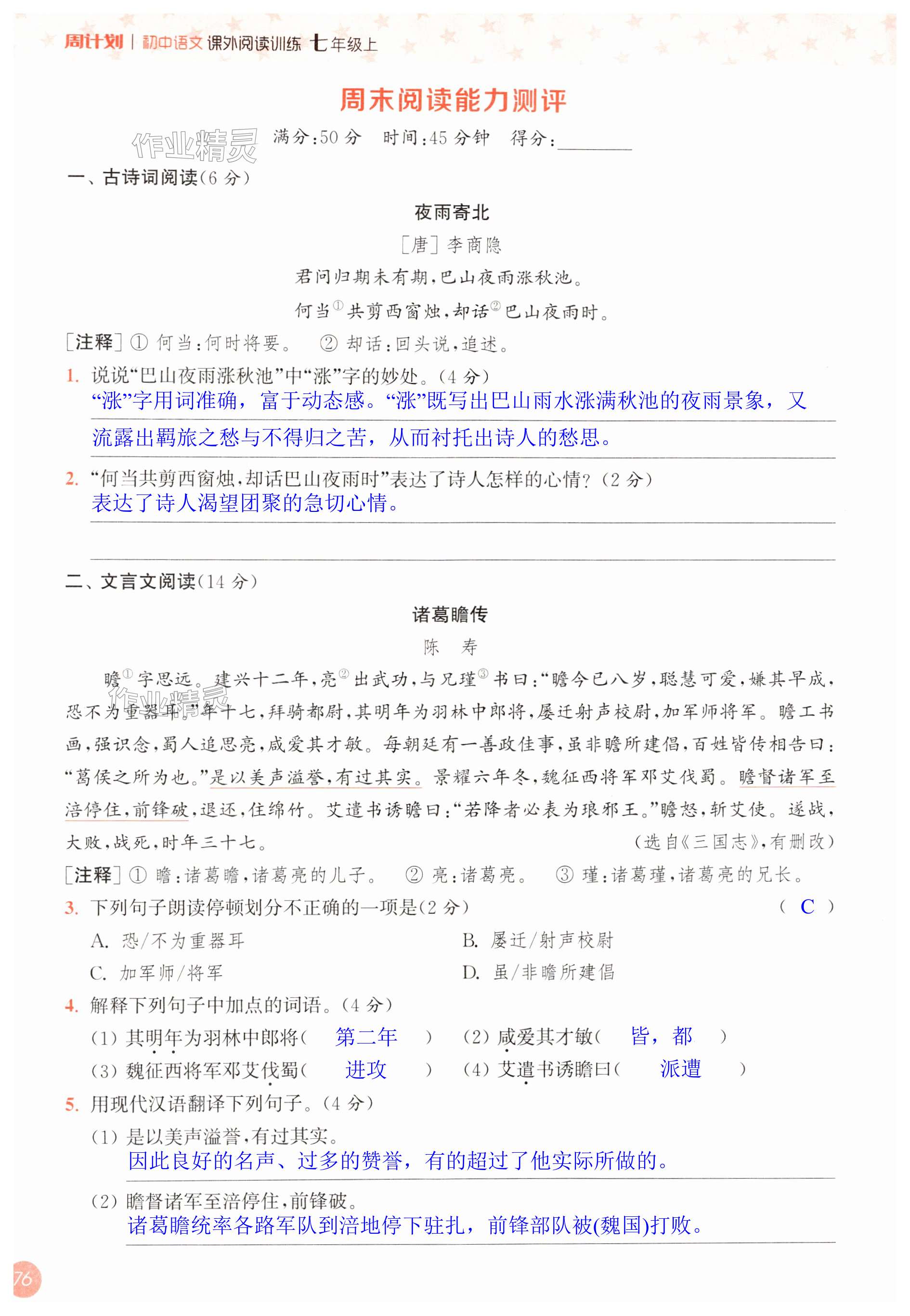 注:目前有些书本章节名称可能整理的还不是很完善,但都是按照顺序排列的,请同学们按照顺序仔细查找。练习册 2024年通城学典周计划课外阅读训练七年级语文上册人教版 答案主要是用来给同学们做完题方便对答案用的,请勿直接抄袭。