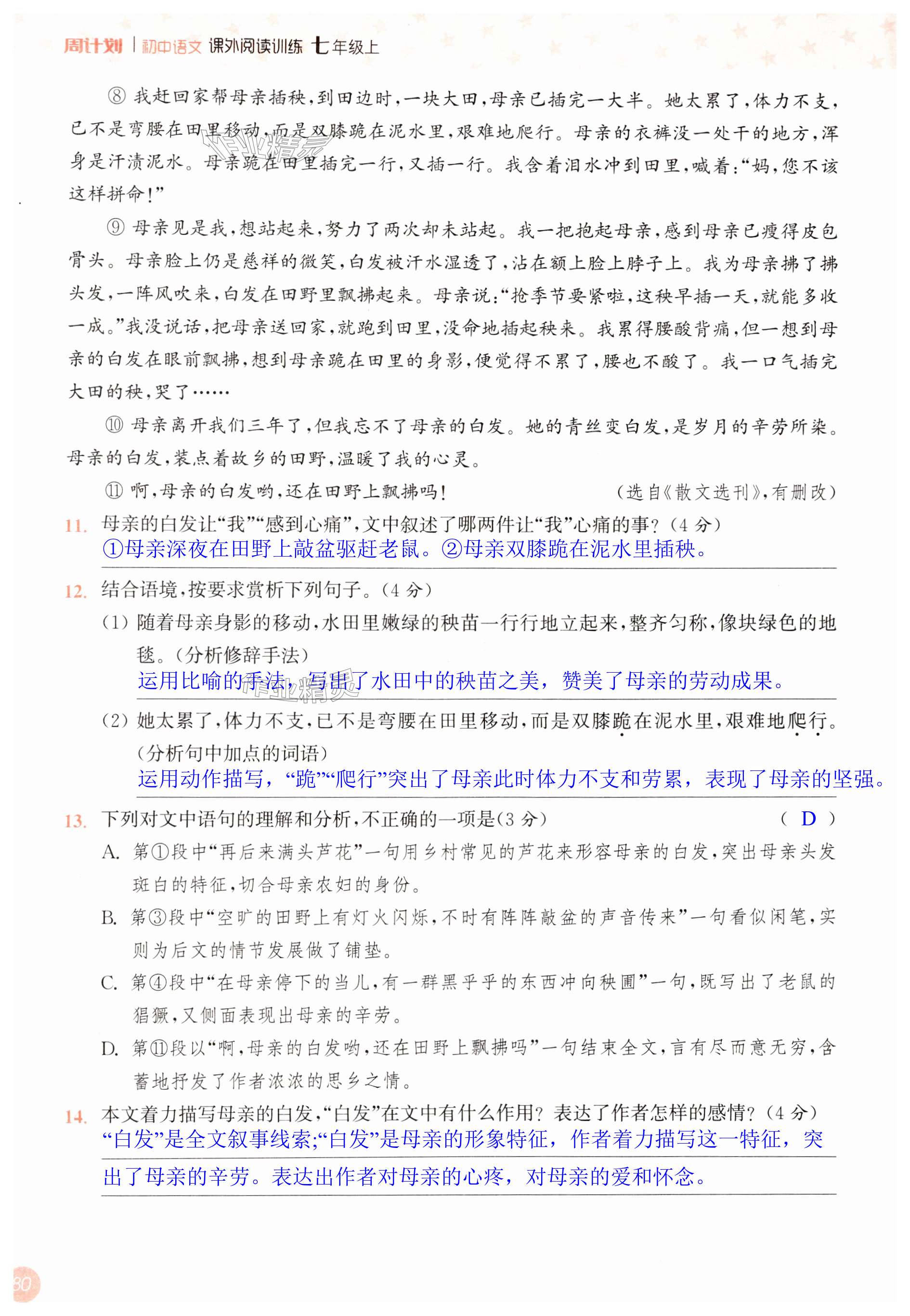 注:目前有些书本章节名称可能整理的还不是很完善,但都是按照顺序排列的,请同学们按照顺序仔细查找。练习册 2024年通城学典周计划课外阅读训练七年级语文上册人教版 答案主要是用来给同学们做完题方便对答案用的,请勿直接抄袭。