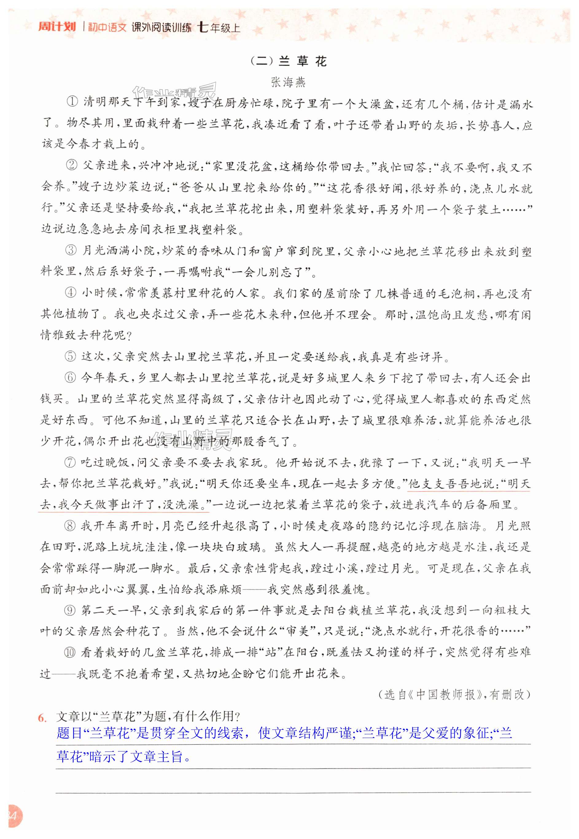 注:目前有些书本章节名称可能整理的还不是很完善,但都是按照顺序排列的,请同学们按照顺序仔细查找。练习册 2024年通城学典周计划课外阅读训练七年级语文上册人教版 答案主要是用来给同学们做完题方便对答案用的,请勿直接抄袭。