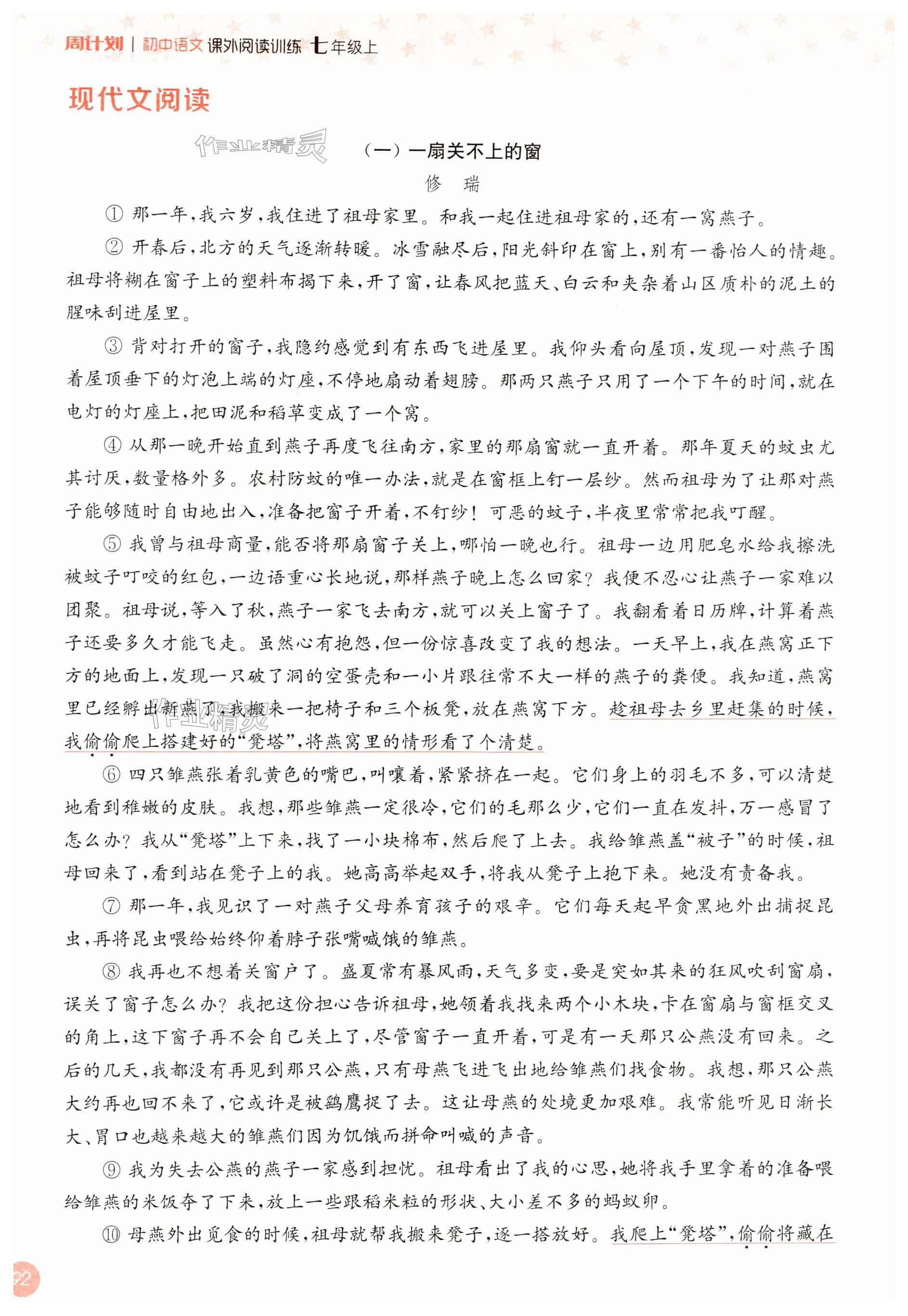 注:目前有些书本章节名称可能整理的还不是很完善,但都是按照顺序排列的,请同学们按照顺序仔细查找。练习册 2024年通城学典周计划课外阅读训练七年级语文上册人教版 答案主要是用来给同学们做完题方便对答案用的,请勿直接抄袭。