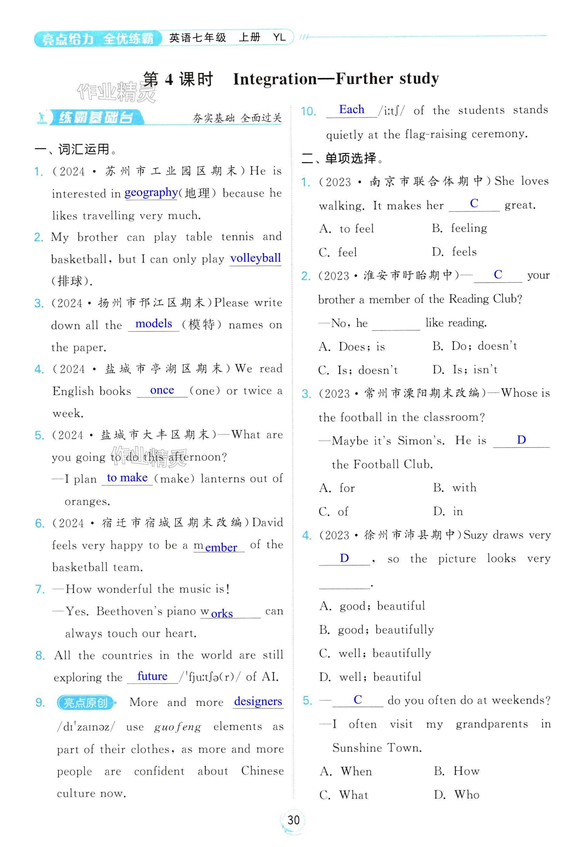 注:目前有些书本章节名称可能整理的还不是很完善,但都是按照顺序排列的,请同学们按照顺序仔细查找。练习册 2024年亮点给力全优练霸七年级英语上册译林版 答案主要是用来给同学们做完题方便对答案用的,请勿直接抄袭。