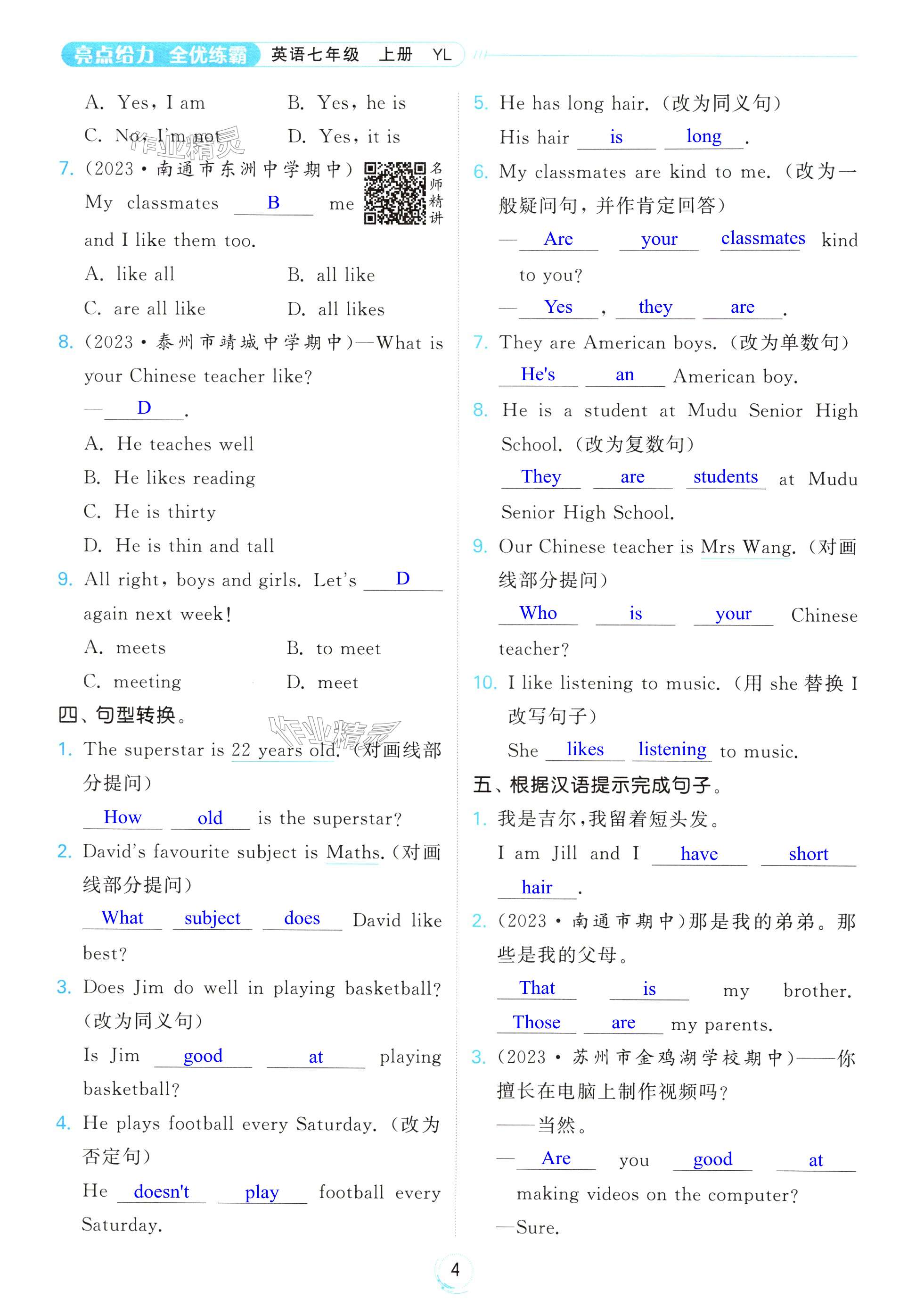 注:目前有些书本章节名称可能整理的还不是很完善,但都是按照顺序排列的,请同学们按照顺序仔细查找。练习册 2024年亮点给力全优练霸七年级英语上册译林版 答案主要是用来给同学们做完题方便对答案用的,请勿直接抄袭。