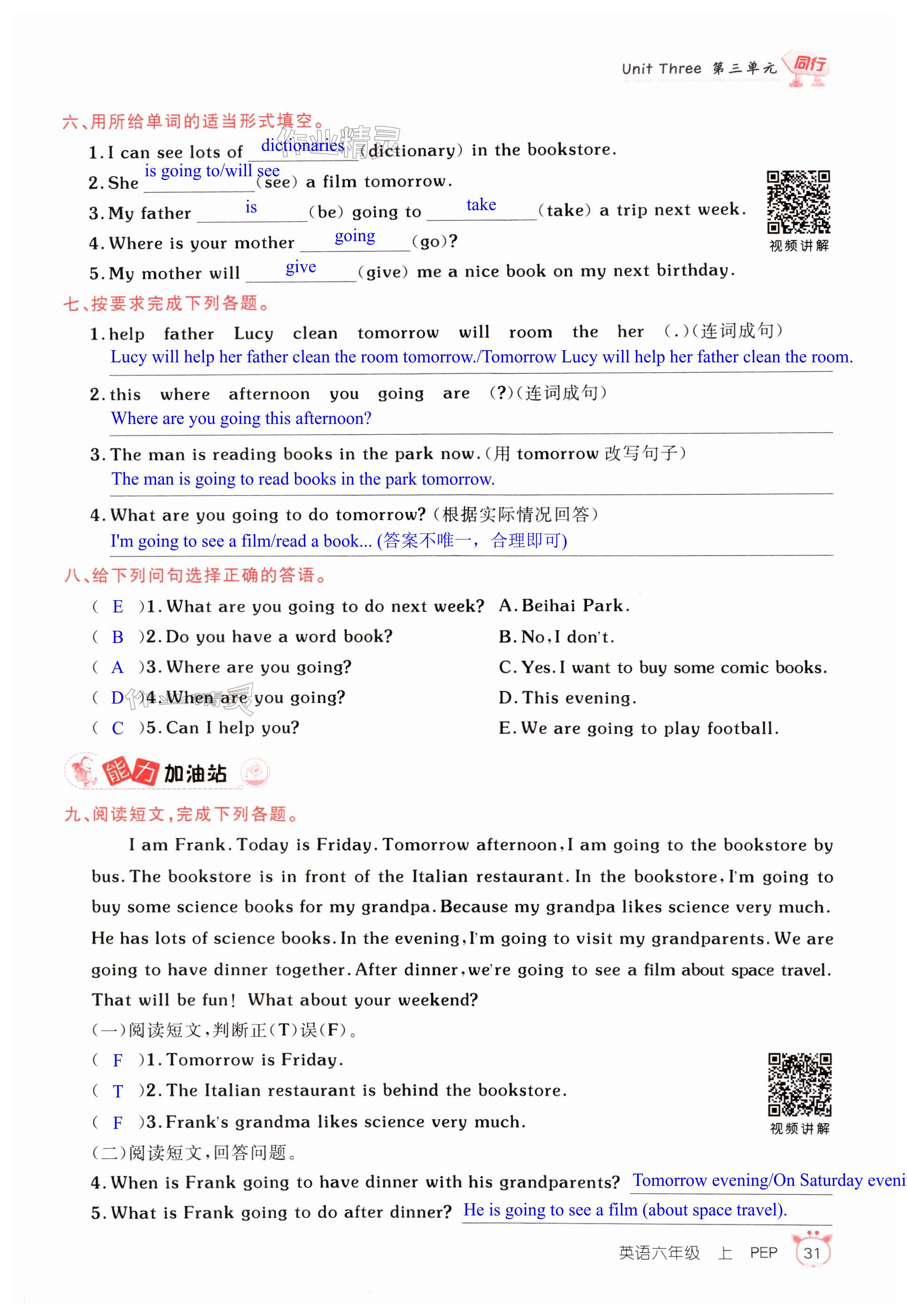注:目前有些书本章节名称可能整理的还不是很完善,但都是按照顺序排列的,请同学们按照顺序仔细查找。练习册 2024年同行课课100分过关作业六年级英语上册人教版 答案主要是用来给同学们做完题方便对答案用的,请勿直接抄袭。