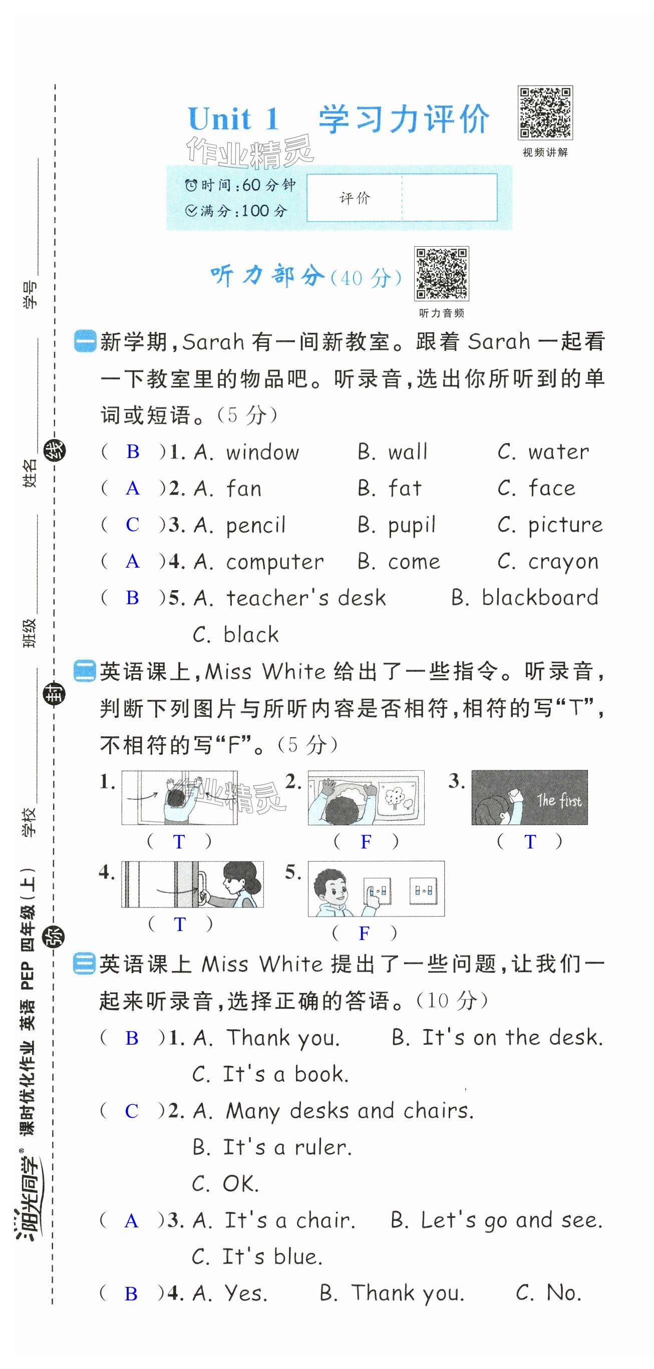 注:目前有些书本章节名称可能整理的还不是很完善,但都是按照顺序排列的,请同学们按照顺序仔细查找。练习册 2024年阳光同学课时优化作业四年级英语上册人教PEP版 答案主要是用来给同学们做完题方便对答案用的,请勿直接抄袭。