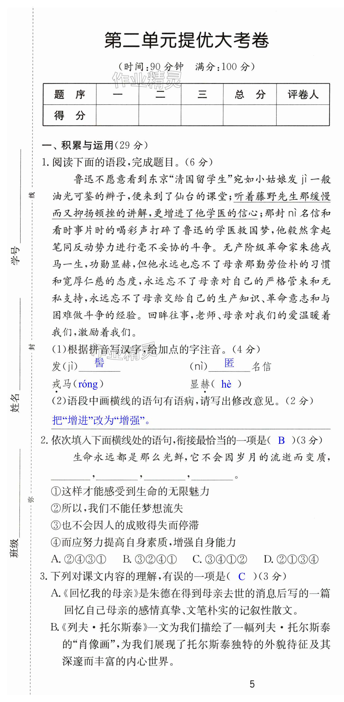 注:目前有些书本章节名称可能整理的还不是很完善,但都是按照顺序排列的,请同学们按照顺序仔细查找。练习册 2024年课时训练八年级语文上册人教版江苏人民出版社 答案主要是用来给同学们做完题方便对答案用的,请勿直接抄袭。