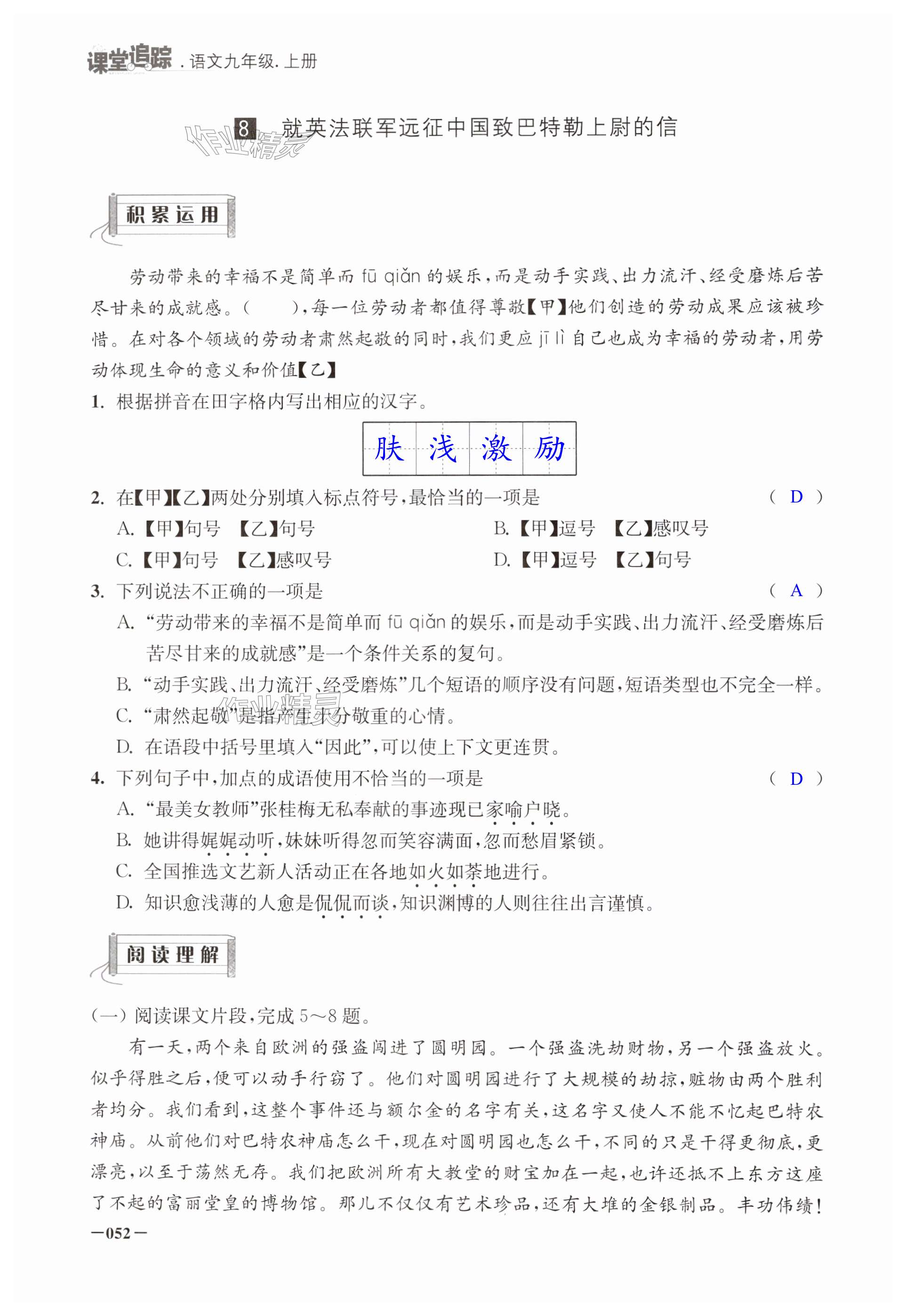 注:目前有些书本章节名称可能整理的还不是很完善,但都是按照顺序排列的,请同学们按照顺序仔细查找。练习册 2024年课堂追踪九年级语文上册人教版 答案主要是用来给同学们做完题方便对答案用的,请勿直接抄袭。
