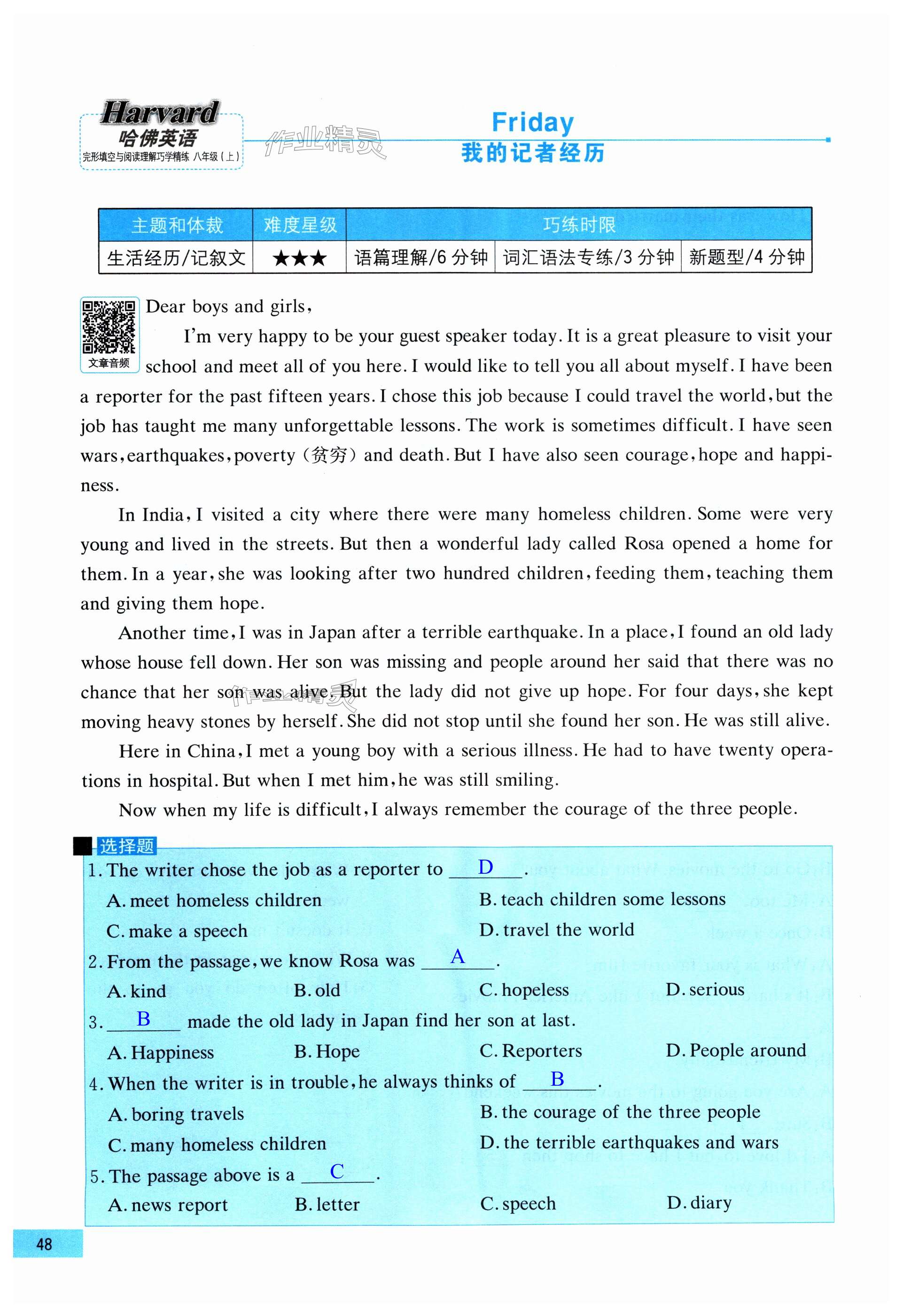 注:目前有些书本章节名称可能整理的还不是很完善,但都是按照顺序排列的,请同学们按照顺序仔细查找。练习册 2024年哈佛英语完形填空与阅读理解巧学精练八年级上册 答案主要是用来给同学们做完题方便对答案用的,请勿直接抄袭。