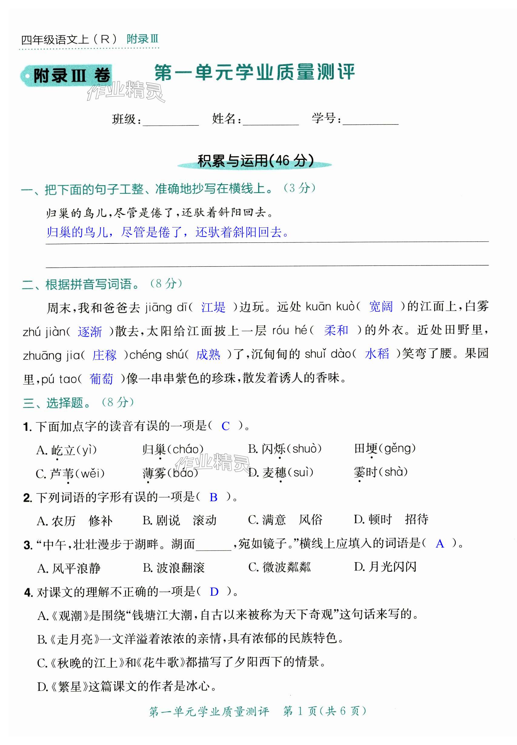 注:目前有些书本章节名称可能整理的还不是很完善,但都是按照顺序排列的,请同学们按照顺序仔细查找。练习册 2024年黄冈小状元作业本四年级语文上册人教版 答案主要是用来给同学们做完题方便对答案用的,请勿直接抄袭。