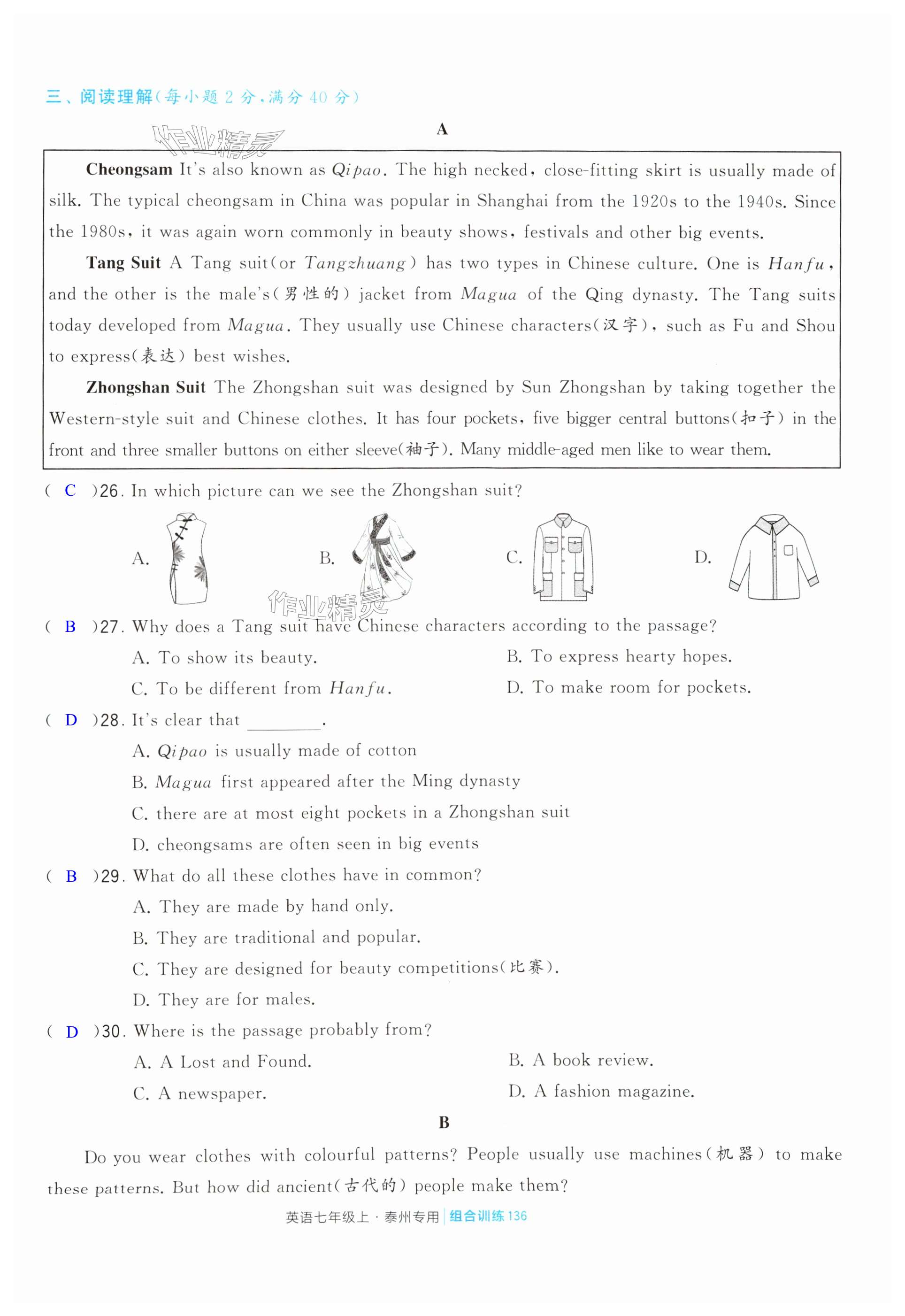 注:目前有些书本章节名称可能整理的还不是很完善,但都是按照顺序排列的,请同学们按照顺序仔细查找。练习册 2024年学霸组合训练七年级英语上册译林版泰州专版 答案主要是用来给同学们做完题方便对答案用的,请勿直接抄袭。