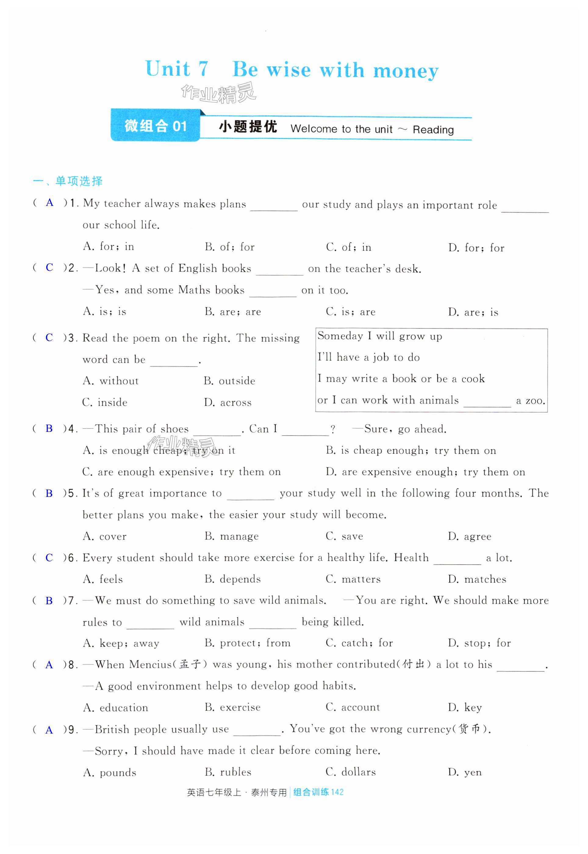2024年学霸组合训练七年级英语上册译林版泰州专版