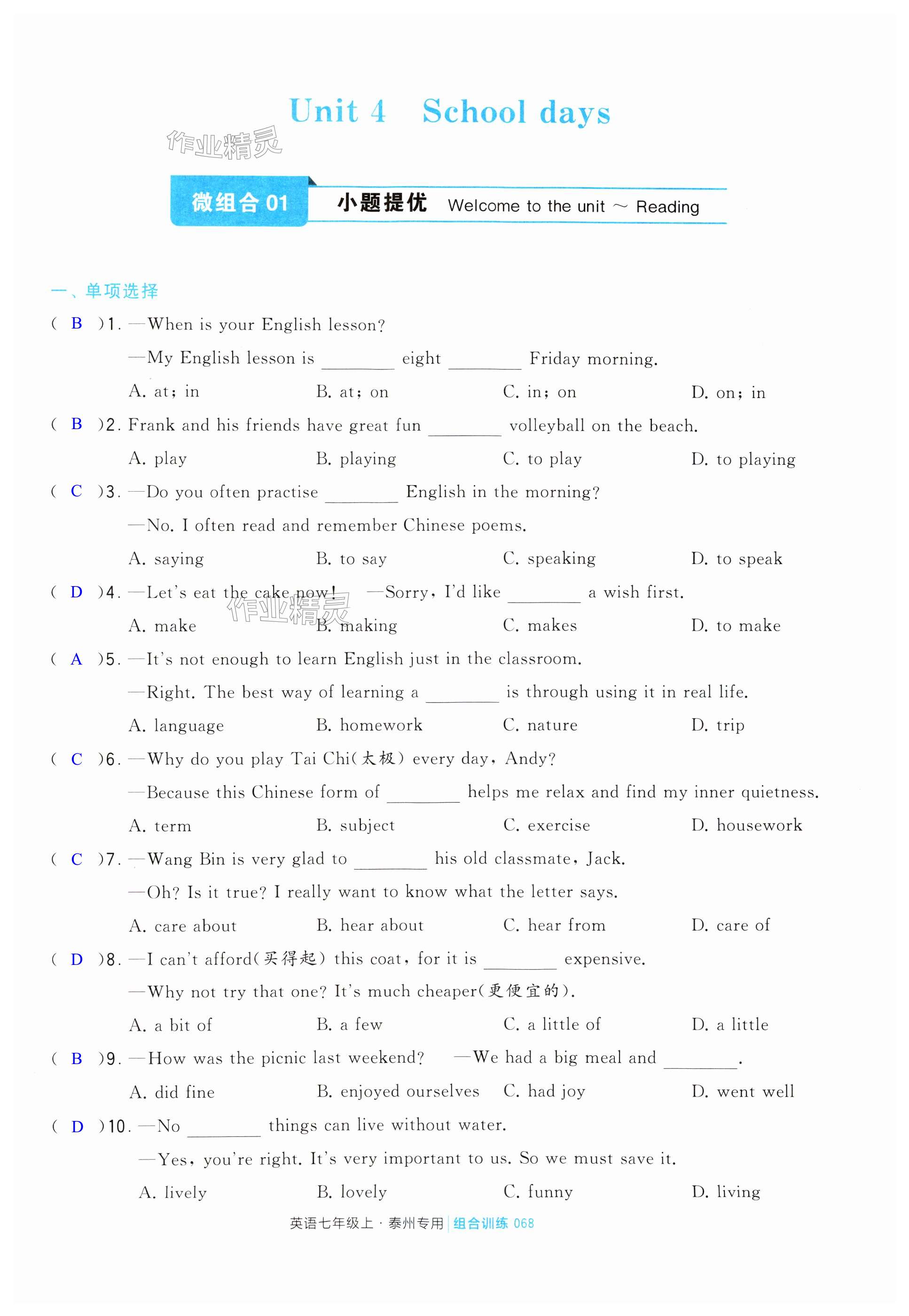注:目前有些书本章节名称可能整理的还不是很完善,但都是按照顺序排列的,请同学们按照顺序仔细查找。练习册 2024年学霸组合训练七年级英语上册译林版泰州专版 答案主要是用来给同学们做完题方便对答案用的,请勿直接抄袭。