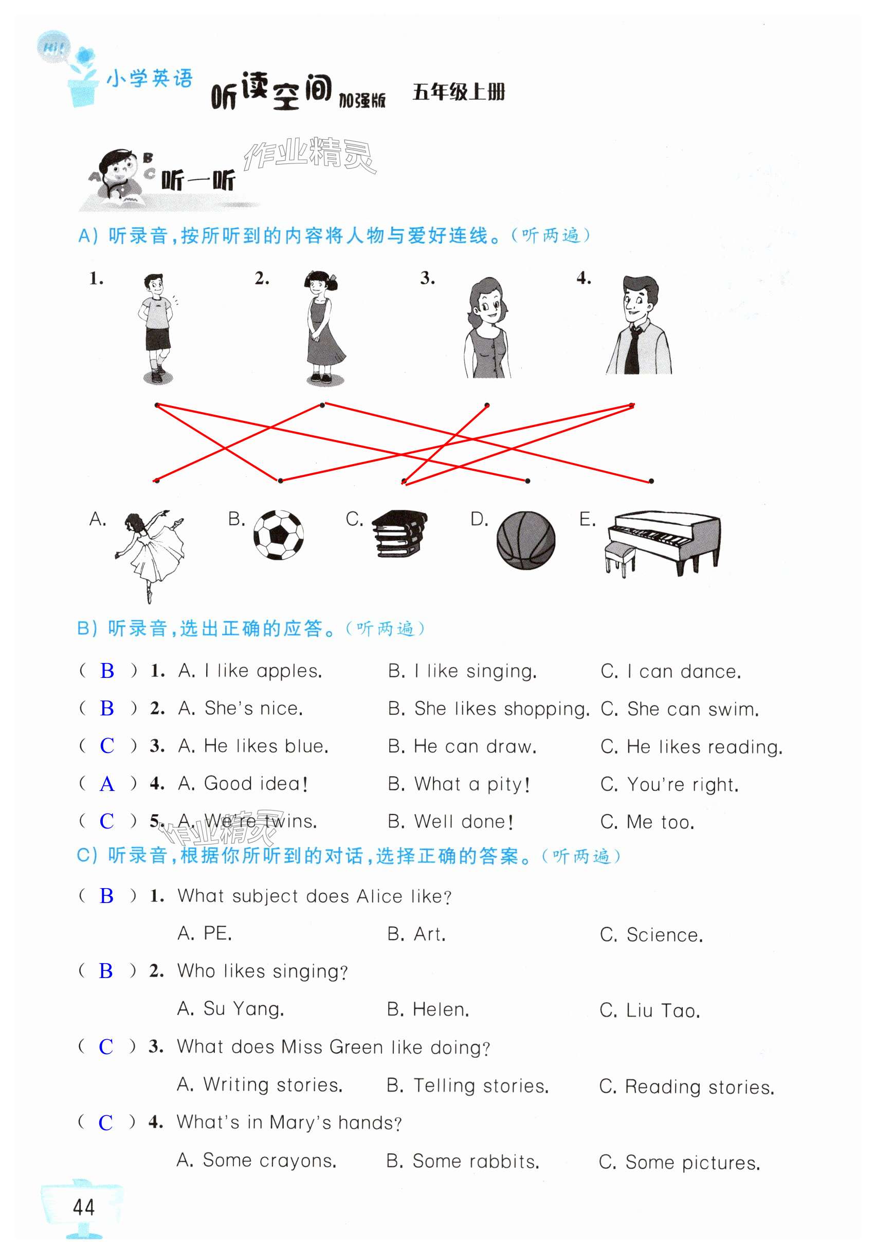 注:目前有些书本章节名称可能整理的还不是很完善,但都是按照顺序排列的,请同学们按照顺序仔细查找。练习册 2024年英语听读空间五年级上册加强版 答案主要是用来给同学们做完题方便对答案用的,请勿直接抄袭。