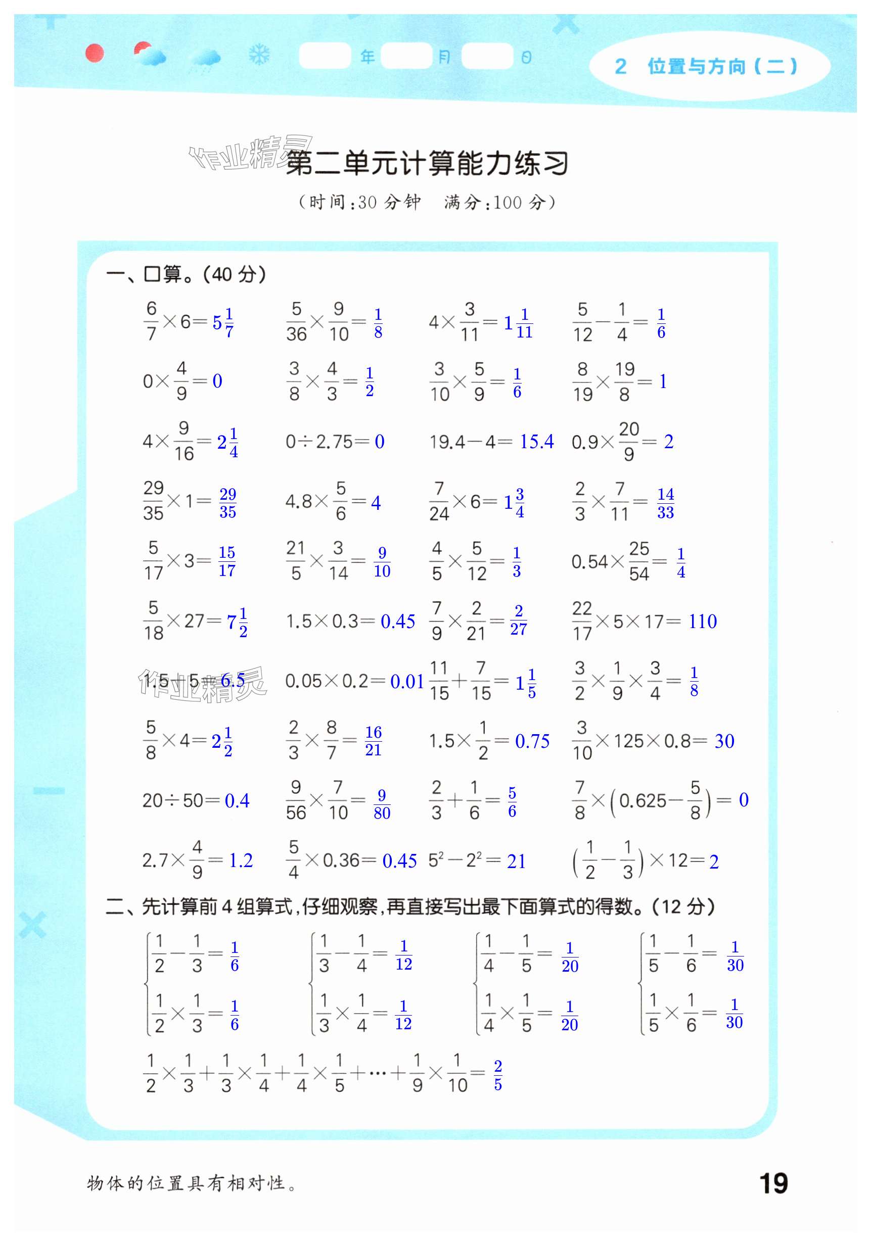 注:目前有些书本章节名称可能整理的还不是很完善,但都是按照顺序排列的,请同学们按照顺序仔细查找。练习册 2024年口算大通关六年级数学上册人教版 答案主要是用来给同学们做完题方便对答案用的,请勿直接抄袭。