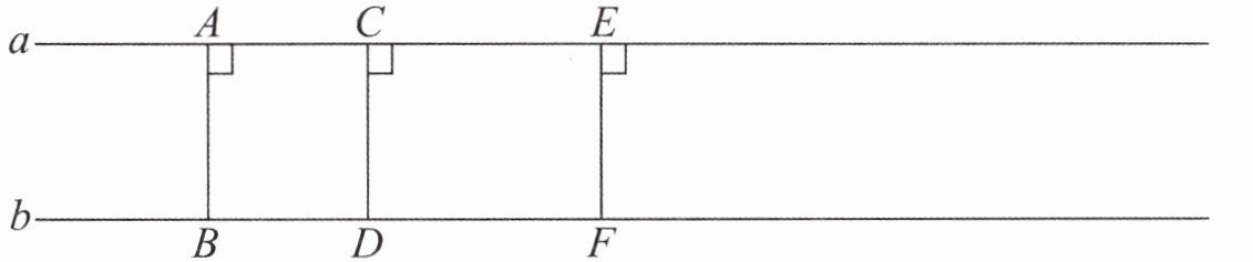 3. 已知直线a平行于直线b,量一量线段AB,CD,EF的长度,发现平行线间的距离处处( )。