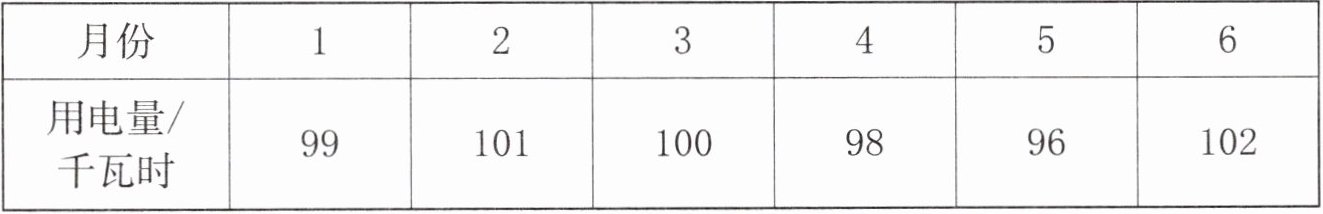 | 用电量/千瓦时 | 99 | 101 | 100 | 98 | 96 | 102 |