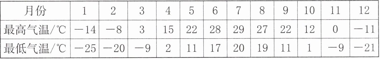 |最高气温/$^{\circ }C$|-14|-8|3|15|22|28|29|27|22|12|0|-11|
