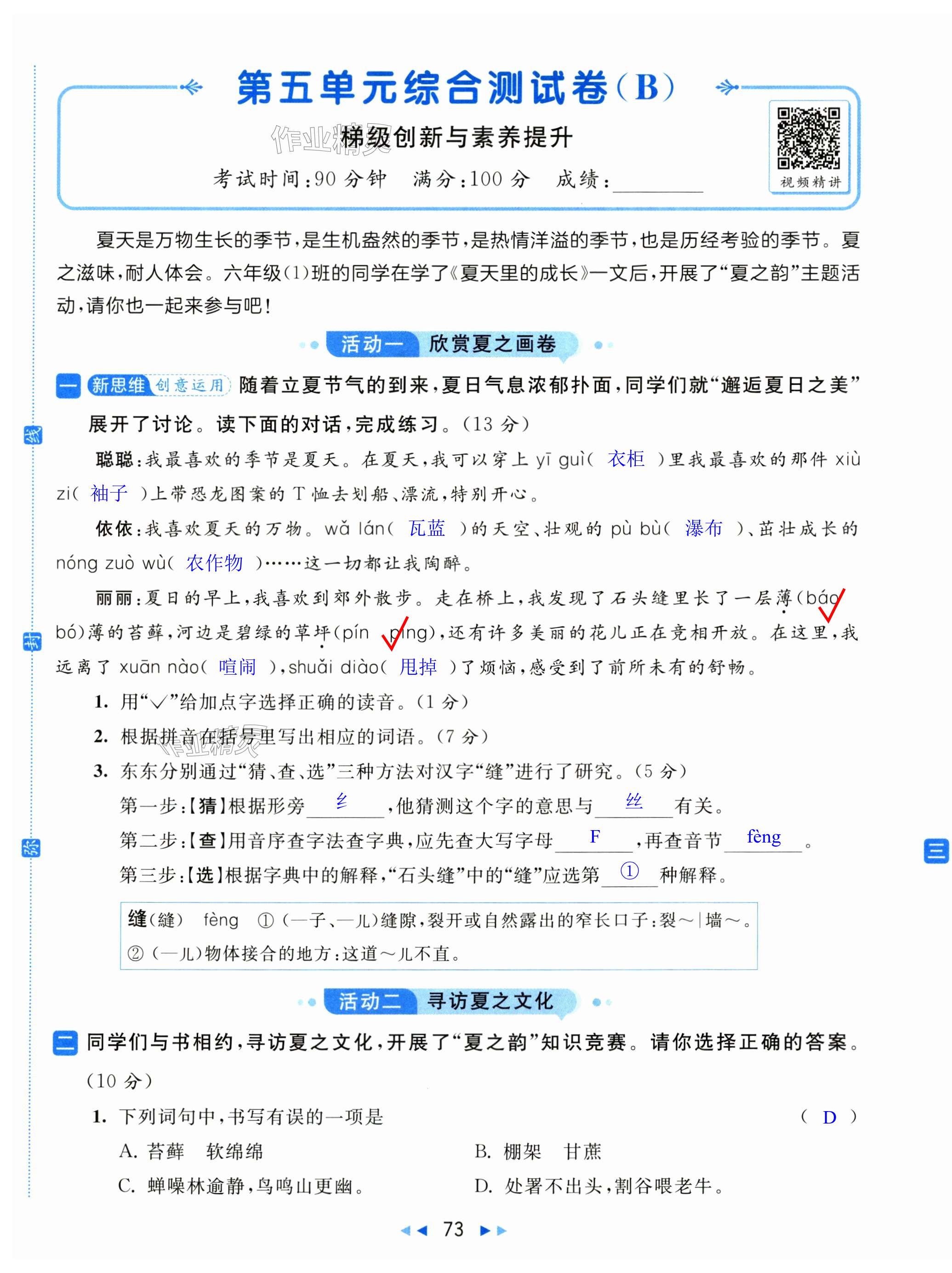 注:目前有些书本章节名称可能整理的还不是很完善,但都是按照顺序排列的,请同学们按照顺序仔细查找。练习册 2024年亮点给力大试卷六年级语文上册人教版 答案主要是用来给同学们做完题方便对答案用的,请勿直接抄袭。