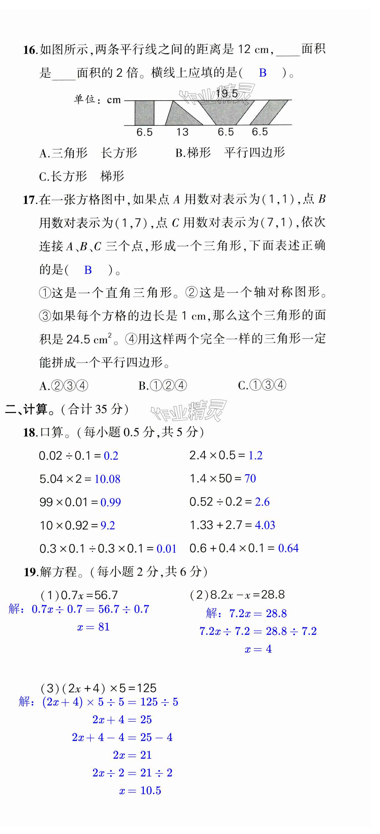 注:目前有些书本章节名称可能整理的还不是很完善,但都是按照顺序排列的,请同学们按照顺序仔细查找。练习册 2024年状元成才路创优作业100分五年级数学上册人教版浙江专版 答案主要是用来给同学们做完题方便对答案用的,请勿直接抄袭。