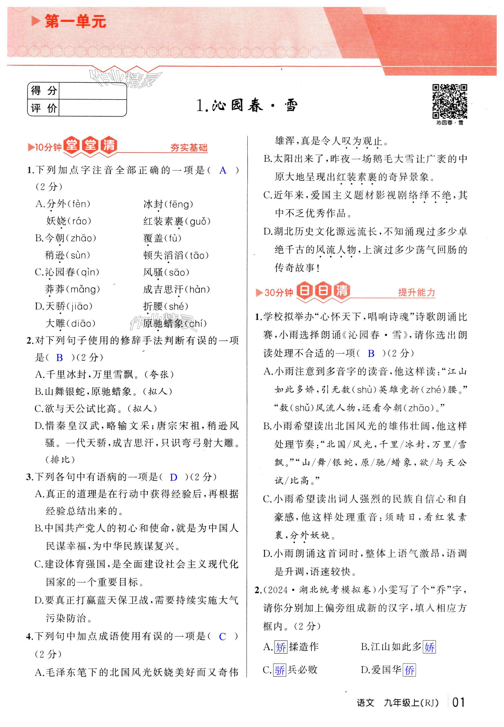 《2024年四清导航九年级语文上册人教版黄冈专版》