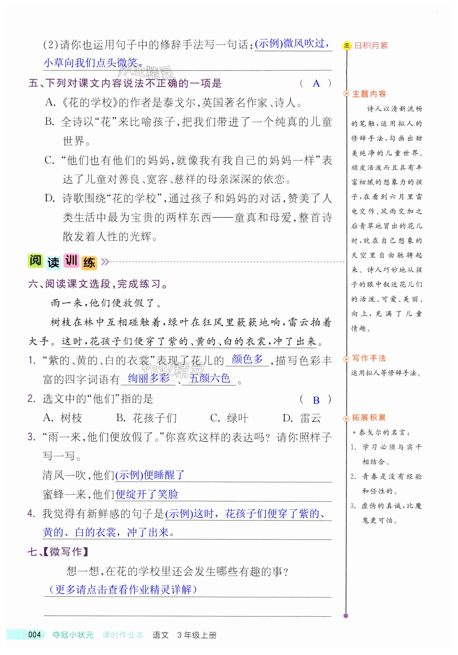 注:目前有些书本章节名称可能整理的还不是很完善,但都是按照顺序排列的,请同学们按照顺序仔细查找。练习册 2024年夺冠小状元课时作业本三年级语文上册人教版 答案主要是用来给同学们做完题方便对答案用的,请勿直接抄袭。