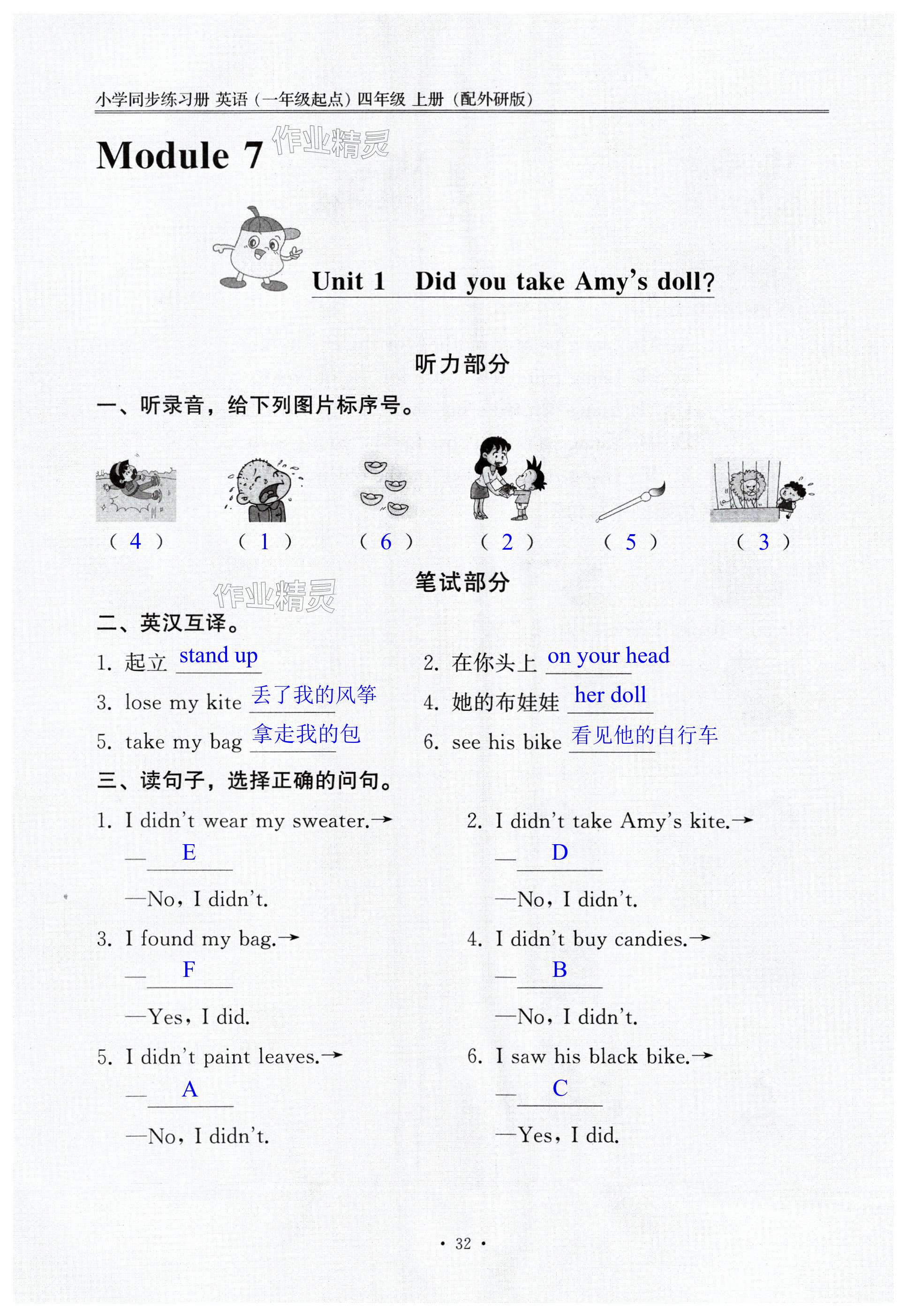 注:目前有些书本章节名称可能整理的还不是很完善,但都是按照顺序排列的,请同学们按照顺序仔细查找。练习册 2024年同步练习册外语教学与研究出版社四年级英语上册外研版一年级起点山东专版 答案主要是用来给同学们做完题方便对答案用的,请勿直接抄袭。