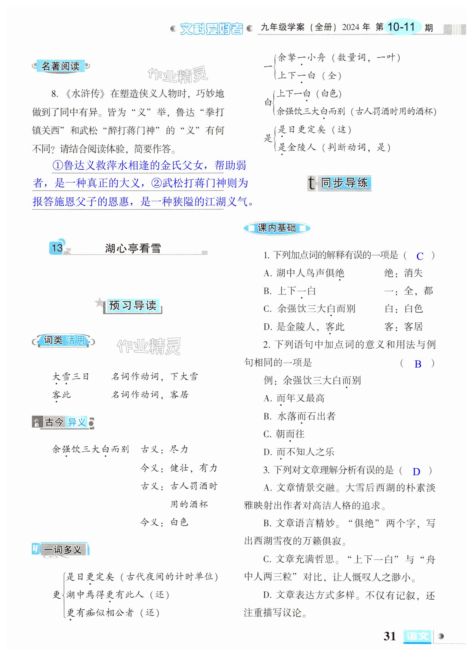 注:目前有些书本章节名称可能整理的还不是很完善,但都是按照顺序排列的,请同学们按照顺序仔细查找。练习册 2024年文科爱好者九年级语文全一册人教版第10-11期 答案主要是用来给同学们做完题方便对答案用的,请勿直接抄袭。