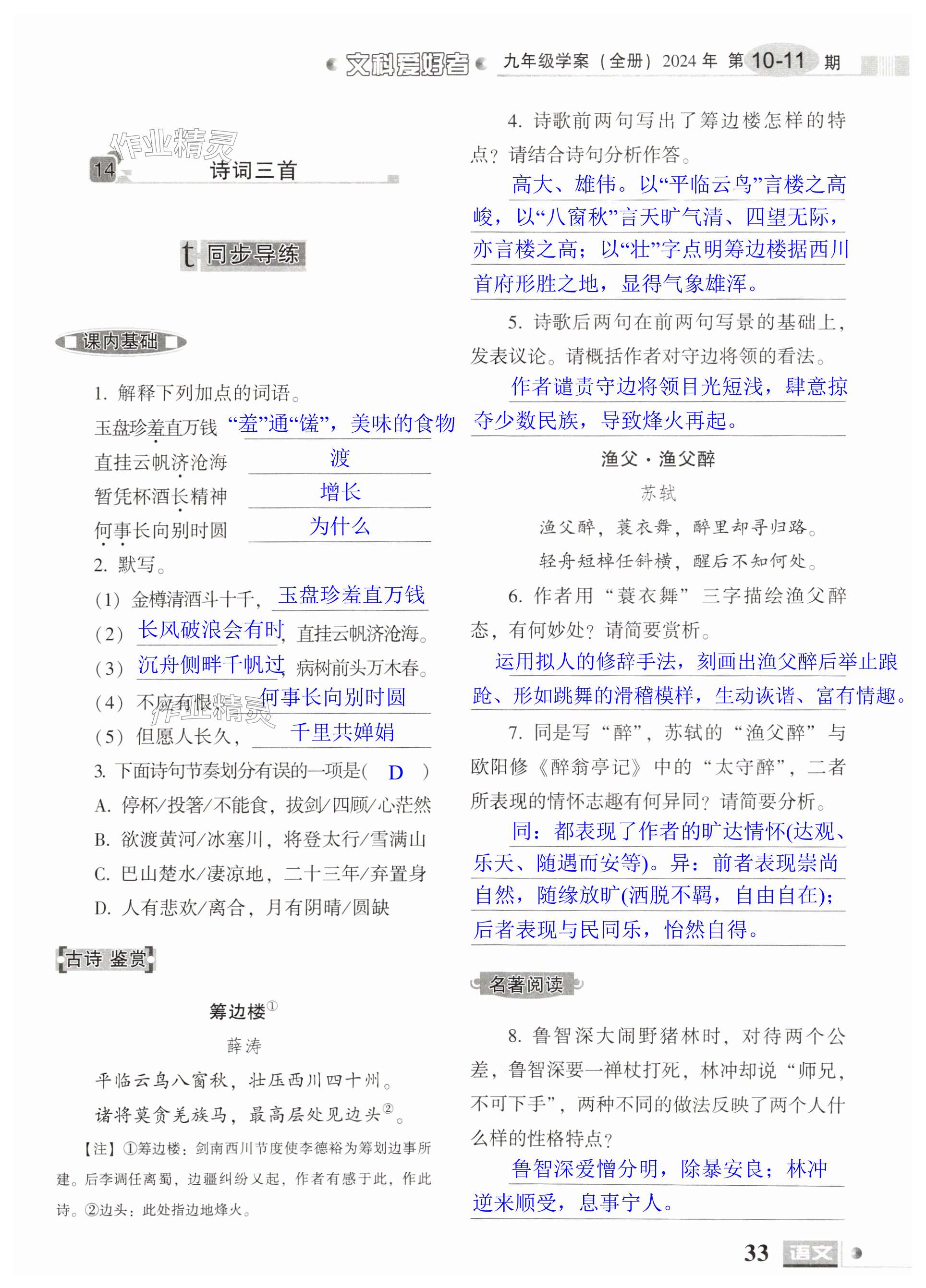 注:目前有些书本章节名称可能整理的还不是很完善,但都是按照顺序排列的,请同学们按照顺序仔细查找。练习册 2024年文科爱好者九年级语文全一册人教版第10-11期 答案主要是用来给同学们做完题方便对答案用的,请勿直接抄袭。