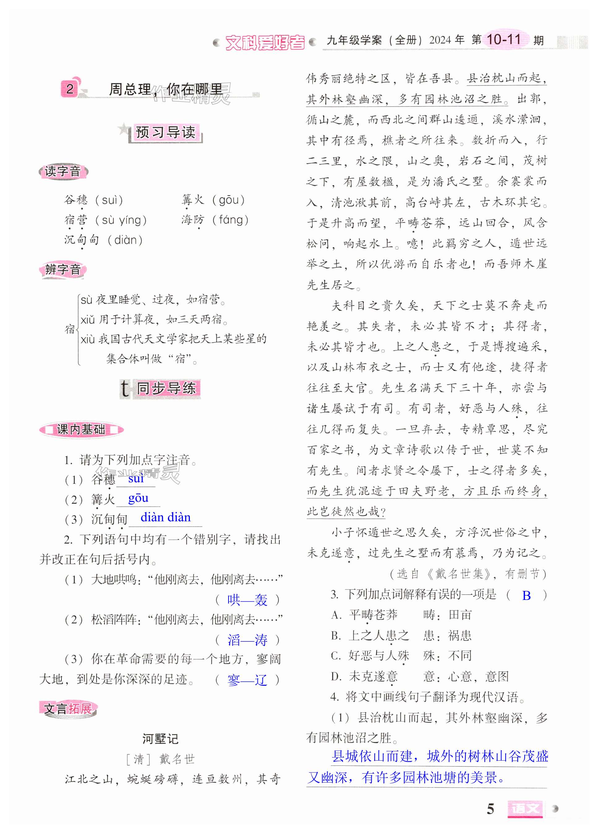 注:目前有些书本章节名称可能整理的还不是很完善,但都是按照顺序排列的,请同学们按照顺序仔细查找。练习册 2024年文科爱好者九年级语文全一册人教版第10-11期 答案主要是用来给同学们做完题方便对答案用的,请勿直接抄袭。