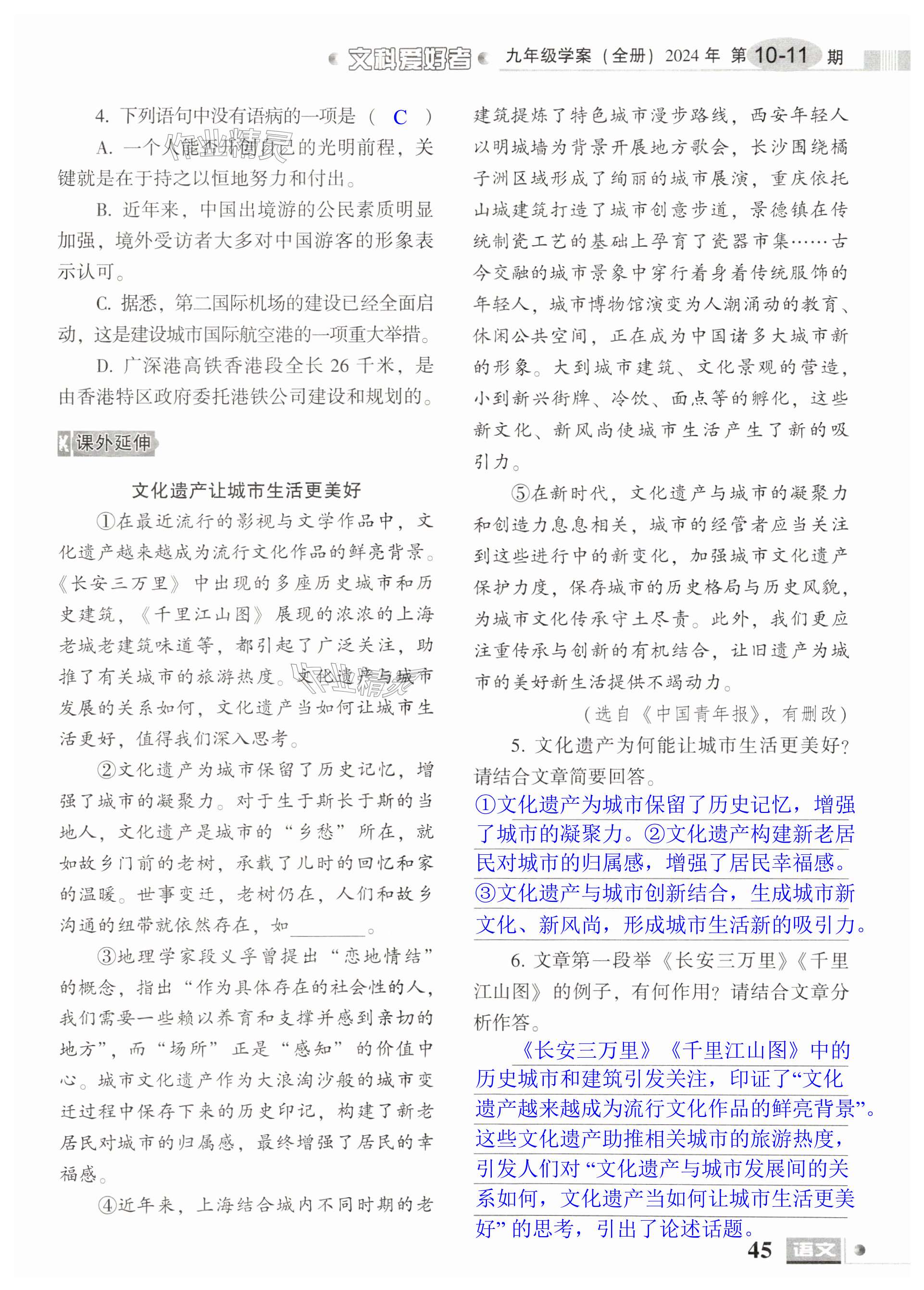 注:目前有些书本章节名称可能整理的还不是很完善,但都是按照顺序排列的,请同学们按照顺序仔细查找。练习册 2024年文科爱好者九年级语文全一册人教版第10-11期 答案主要是用来给同学们做完题方便对答案用的,请勿直接抄袭。