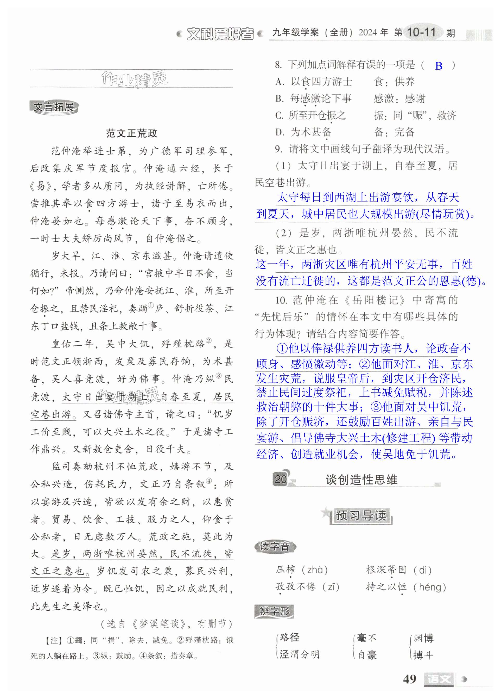 注:目前有些书本章节名称可能整理的还不是很完善,但都是按照顺序排列的,请同学们按照顺序仔细查找。练习册 2024年文科爱好者九年级语文全一册人教版第10-11期 答案主要是用来给同学们做完题方便对答案用的,请勿直接抄袭。