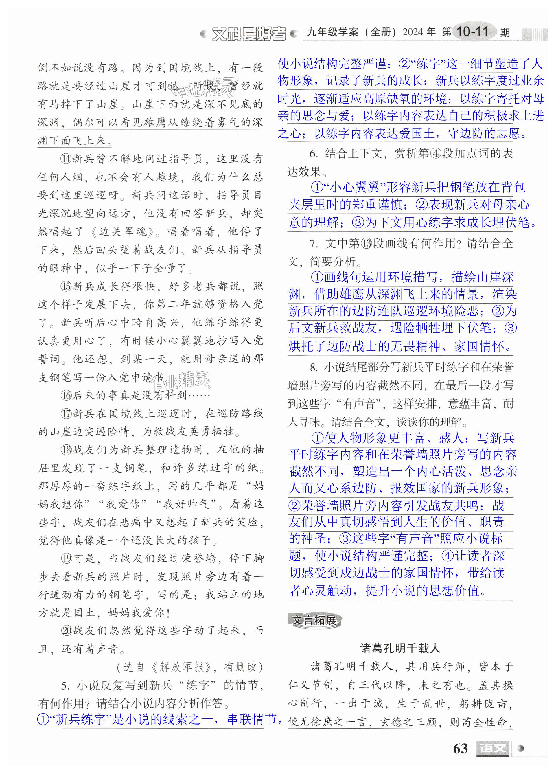 注:目前有些书本章节名称可能整理的还不是很完善,但都是按照顺序排列的,请同学们按照顺序仔细查找。练习册 2024年文科爱好者九年级语文全一册人教版第10-11期 答案主要是用来给同学们做完题方便对答案用的,请勿直接抄袭。