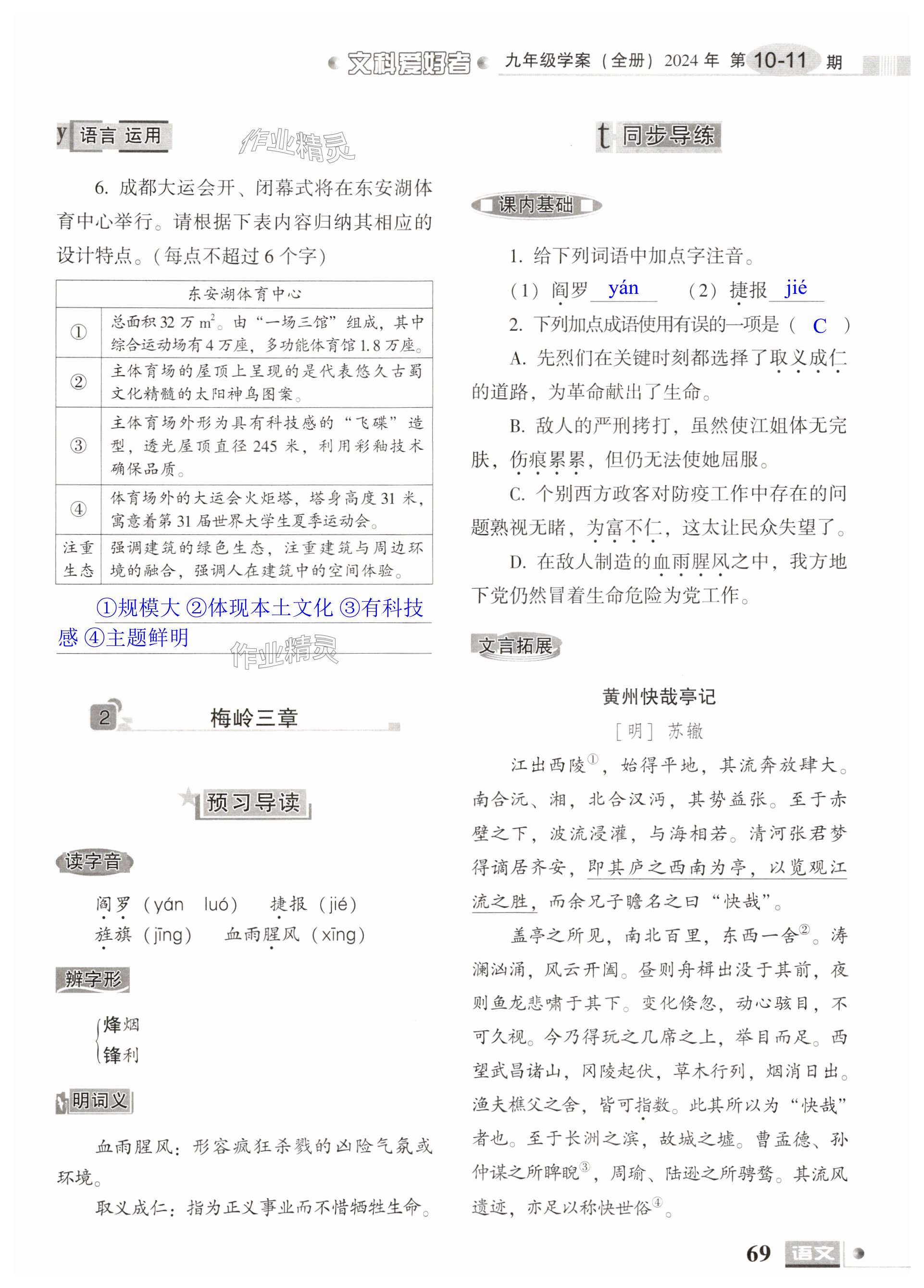 注:目前有些书本章节名称可能整理的还不是很完善,但都是按照顺序排列的,请同学们按照顺序仔细查找。练习册 2024年文科爱好者九年级语文全一册人教版第10-11期 答案主要是用来给同学们做完题方便对答案用的,请勿直接抄袭。