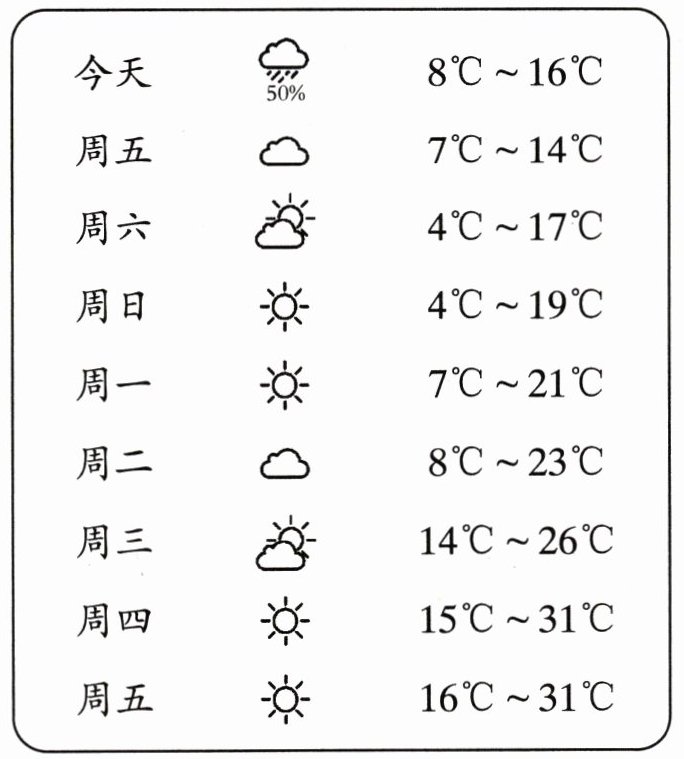 明天,冬冬的妈妈要出差一个星期。如果你是冬冬,看了上面当地的天气预报,将会提醒妈妈什么?______