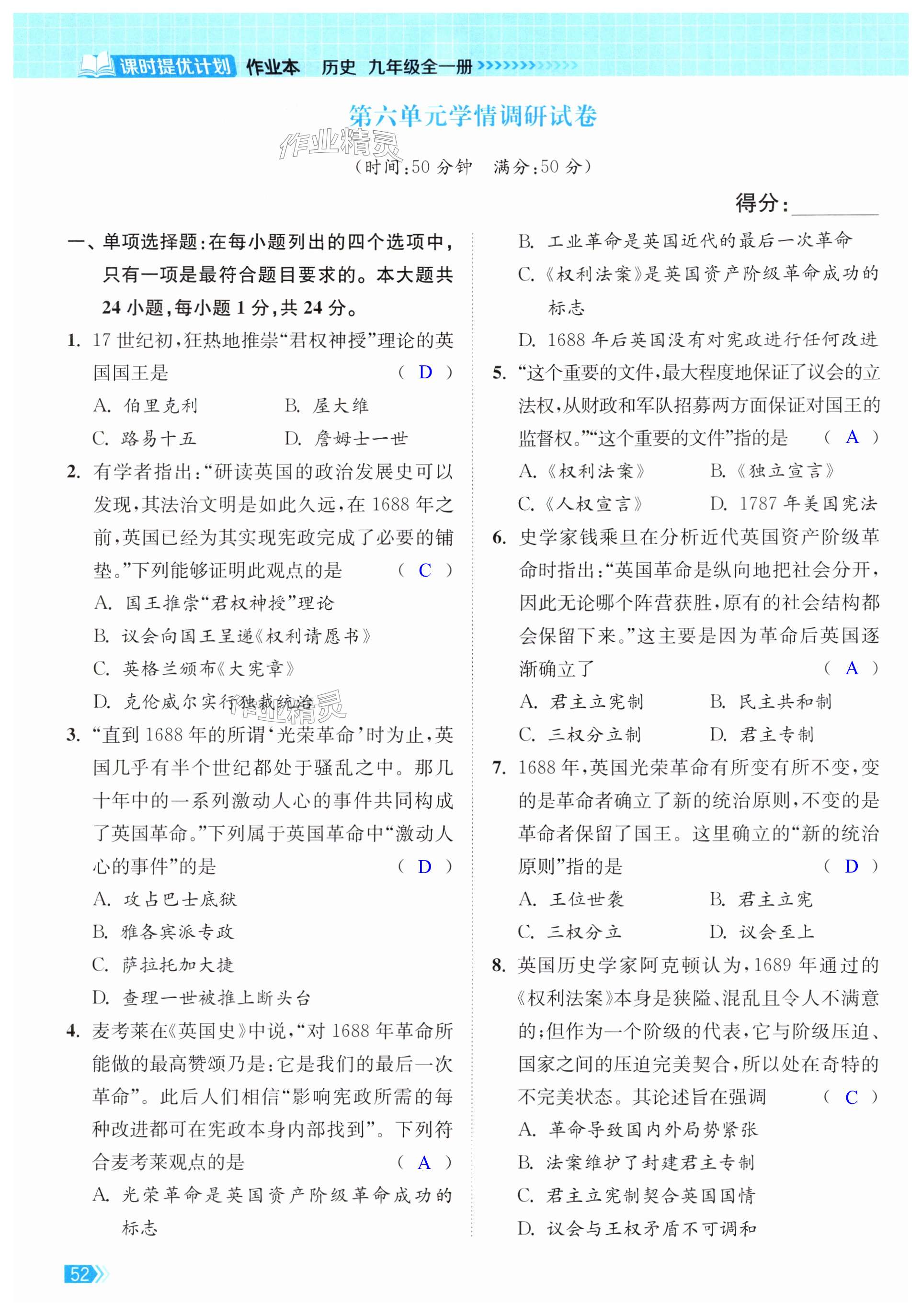 注:目前有些书本章节名称可能整理的还不是很完善,但都是按照顺序排列的,请同学们按照顺序仔细查找。练习册 2024年课时提优计划作业本九年级历史全一册人教版 答案主要是用来给同学们做完题方便对答案用的,请勿直接抄袭。