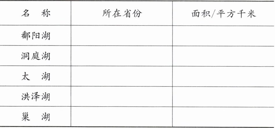 你知道我国五大淡水湖各在哪个省份,面积各是多少平方千米吗?查找资料,填一填。