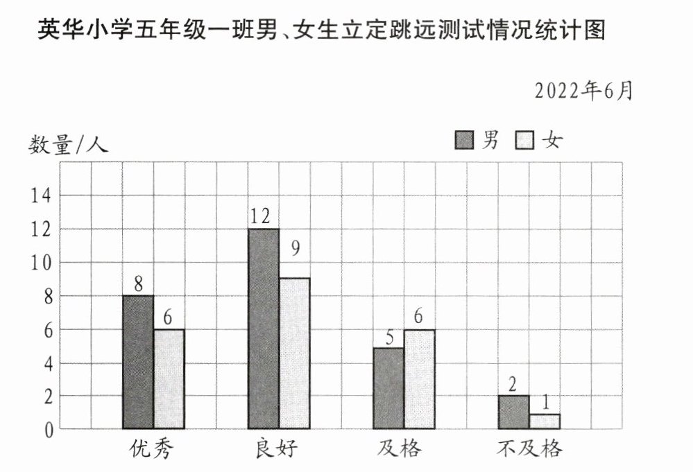 2. 下面是英华小学五年级一班男、女生立定跳远测试情况统计图。根据图中的数据完成填空。