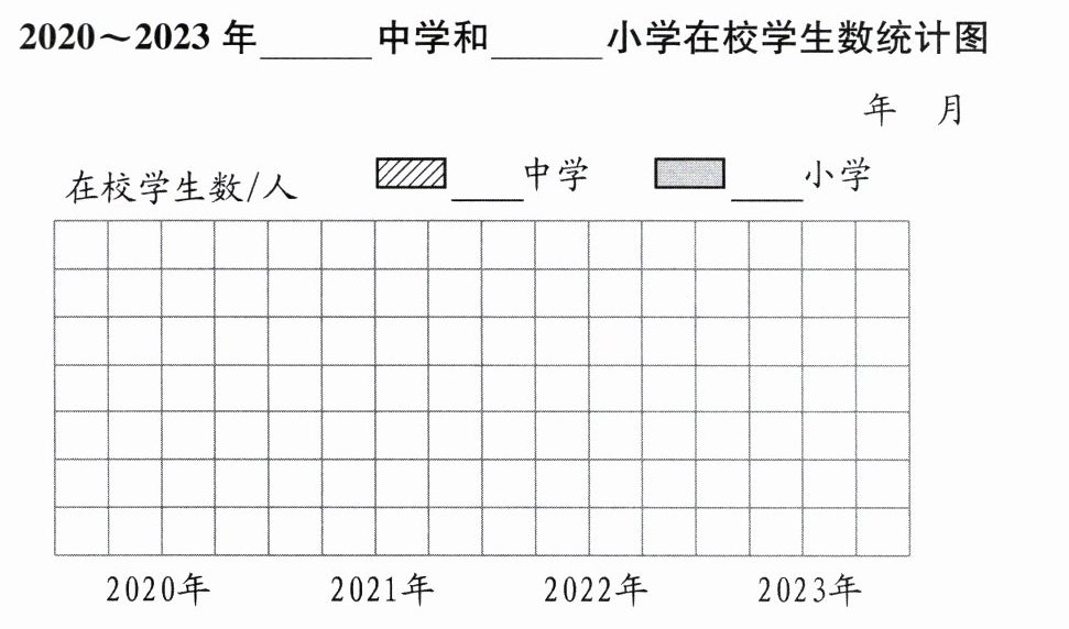 4. 调查自己所在小学和邻近一所初中2020~2023年在校学生数(每年秋学期开学时的人数),完成下面的统计图。