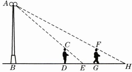 4. 如图,花丛中一根灯杆AB上有一盏路灯A. 灯光下,小明在D点处的影长DE= 3米,沿BD方向走到点G,DG= 5米,这时小明的影长GH= 4米. 如果小明的身高为1.7米,求路灯A离地面的高度.