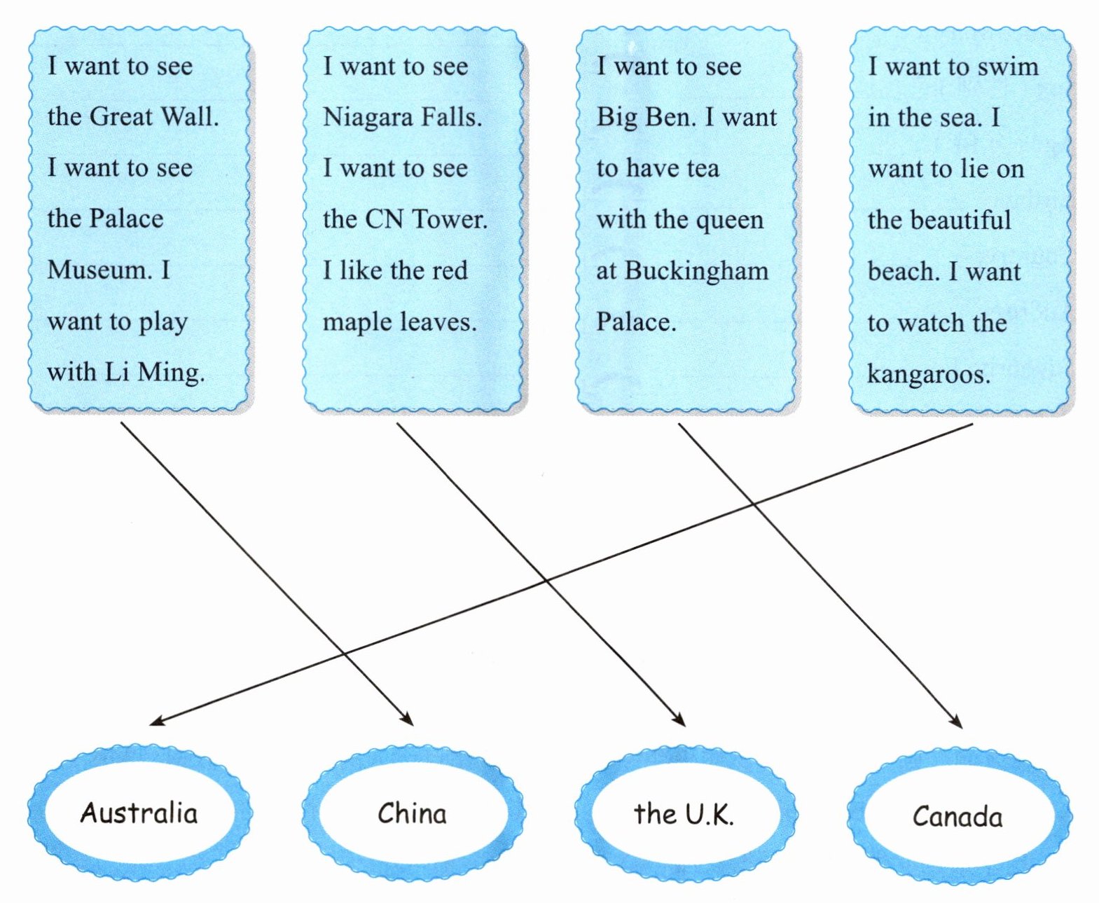 Ⅳ. Read, judge and correct. Danny 为小朋友们推荐的旅游地点,你来判断对不对。不对的请帮粗心的 Danny 把箭头改正。