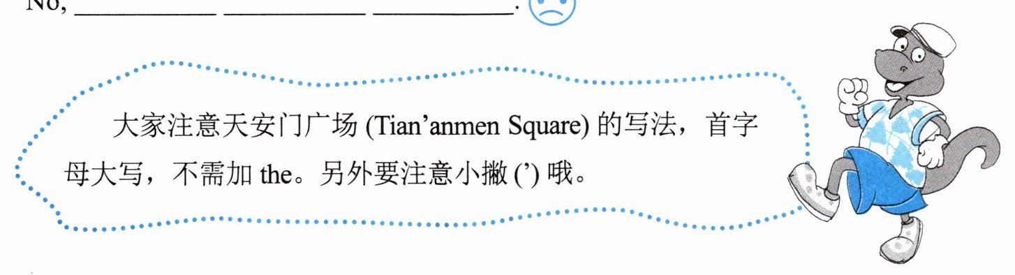 大家注意天安门广场 (Tian'anmen Square) 的写法,首字母大写,不需加 the。另外要注意小撇 (') 哦。