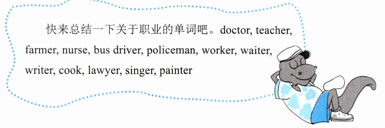 快来总结一下关于职业的单词吧。doctor, teacher, farmer, nurse, bus driver, policeman, worker, waiter, writer, cook, lawyer, singer, painter