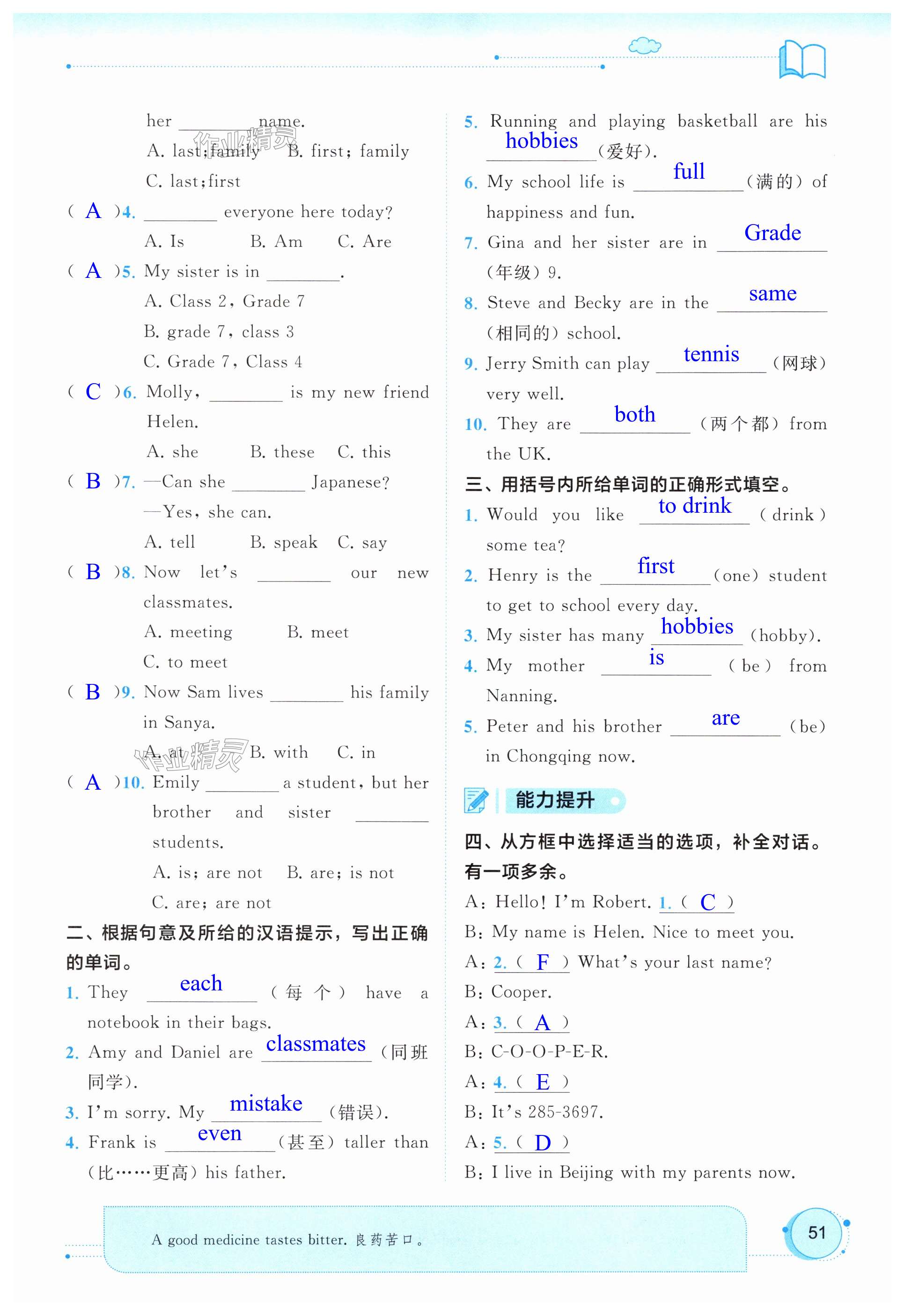 注:目前有些书本章节名称可能整理的还不是很完善,但都是按照顺序排列的,请同学们按照顺序仔细查找。练习册 2024年新课程学习与测评同步学习七年级英语上册人教版 答案主要是用来给同学们做完题方便对答案用的,请勿直接抄袭。