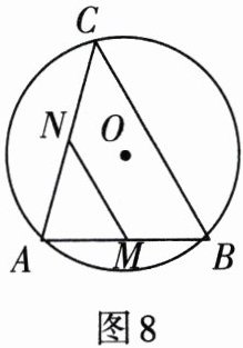 4. 如图8,AB是⊙O的弦,AB= 5,点C是⊙O上的一个动点,且∠ACB= 45°. 若点M,N分别是AB,AC的中点,则MN的最大值是______.