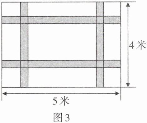 1. 如图3,一块长5米、宽4米的地毯,为了美观设计了两横、两纵的配色条纹(图中阴影部分),已知配色条纹的宽度相同,所占面积是整个地毯面积的$\frac{17}{80}$.