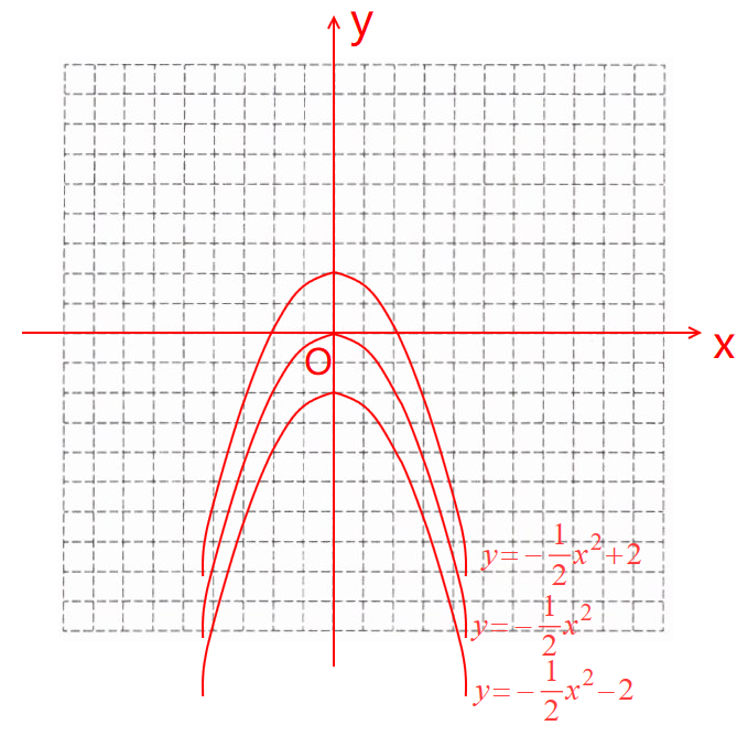 1. 请在正方形网格中建立一个平面直角坐标系,并在同一个平面直角坐标系中,画出二次函数$y= -\frac{1}{2}x^{2},y= -\frac{1}{2}x^{2}+2和y= -\frac{1}{2}x^{2}-2$的图象,分别指出它们的开口方向、对称轴以及顶点坐标.