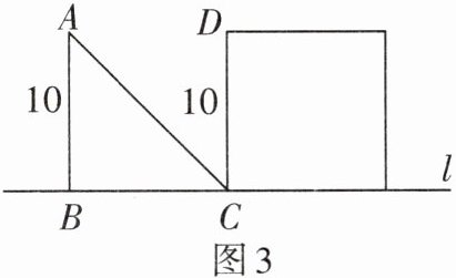 3. 如图3(单位:米),等腰直角三角形$ABC$以2米/秒的速度沿直线$l$向正方形移动,直到$AB与CD$重合,设$x$秒时,三角形与正方形重叠部分的面积为$y$平方米.