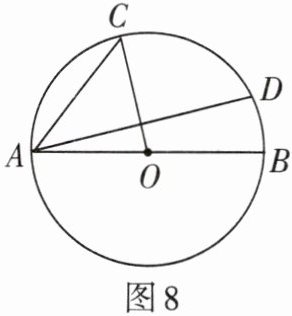 3. 如图8,AB为⊙O的直径,C,D为⊙O上的两点,且C为$\widehat{AD}$的中点,若$\angle BAD= 20^{\circ}$,求$\angle ACO$的度数.