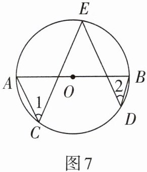 1. 如图7,AB是⊙O的直径,C,D,E都是圆上的点,求∠1+∠2的度数.