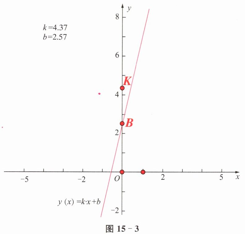 (1)打开动态几何软件,建立直角坐标系.如图 15-3,在 $y$ 轴上构造点 $K$、$B$,分别记它们的纵坐标为 $k$、$b$,画函数 $y= kx+b$ 的图像.