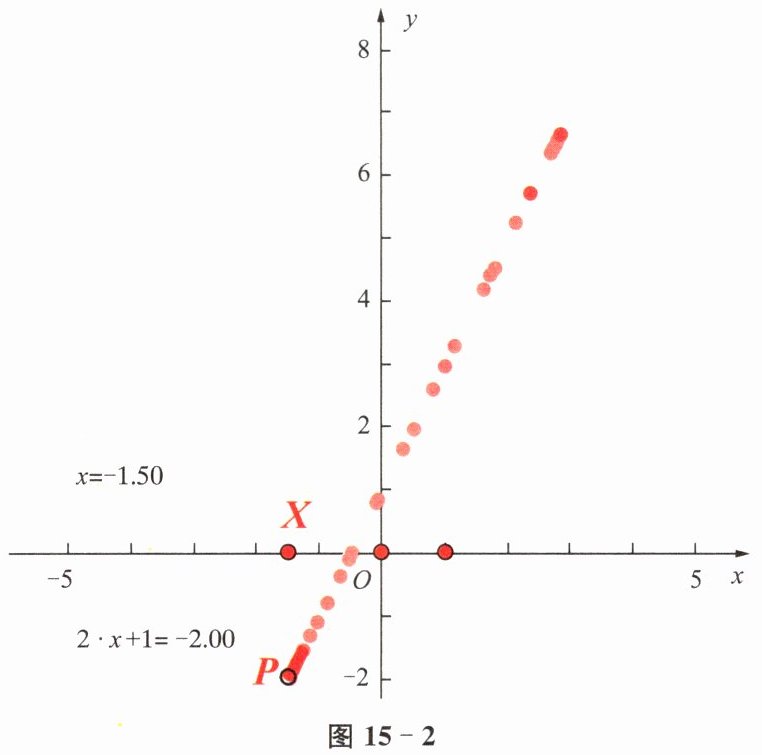 (5)如图 15-2,打开动态几何软件,建立直角坐标系,在 $x$ 轴上构造一个点 $X$,记横坐标为 $x$,绘制动点 $P(x,2x+1)$;移动点 $X$,观察点 $P$ 经过的路径痕迹.你有什么发现?